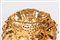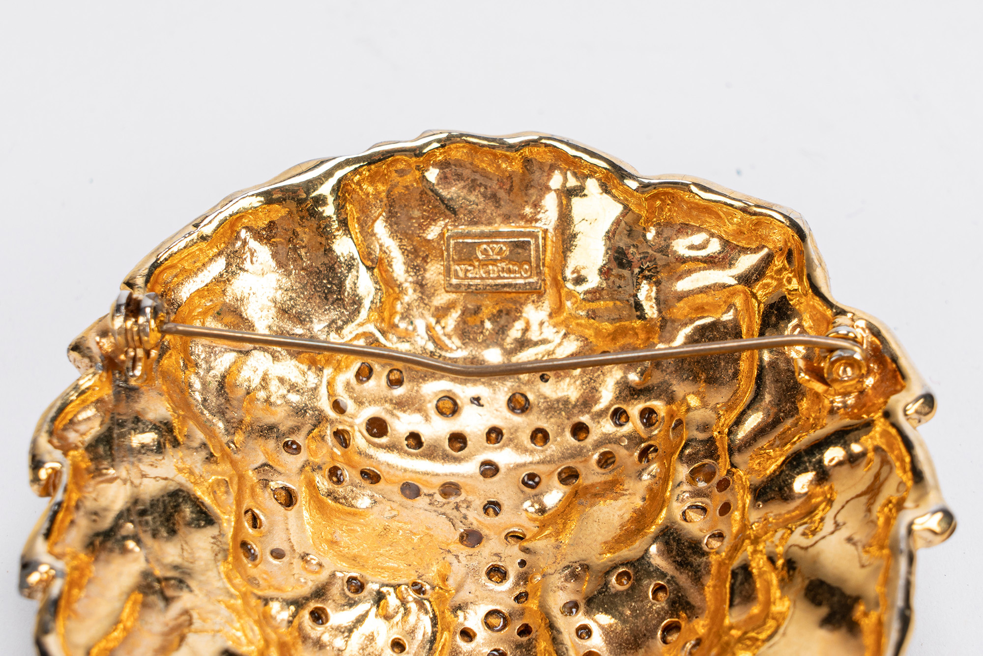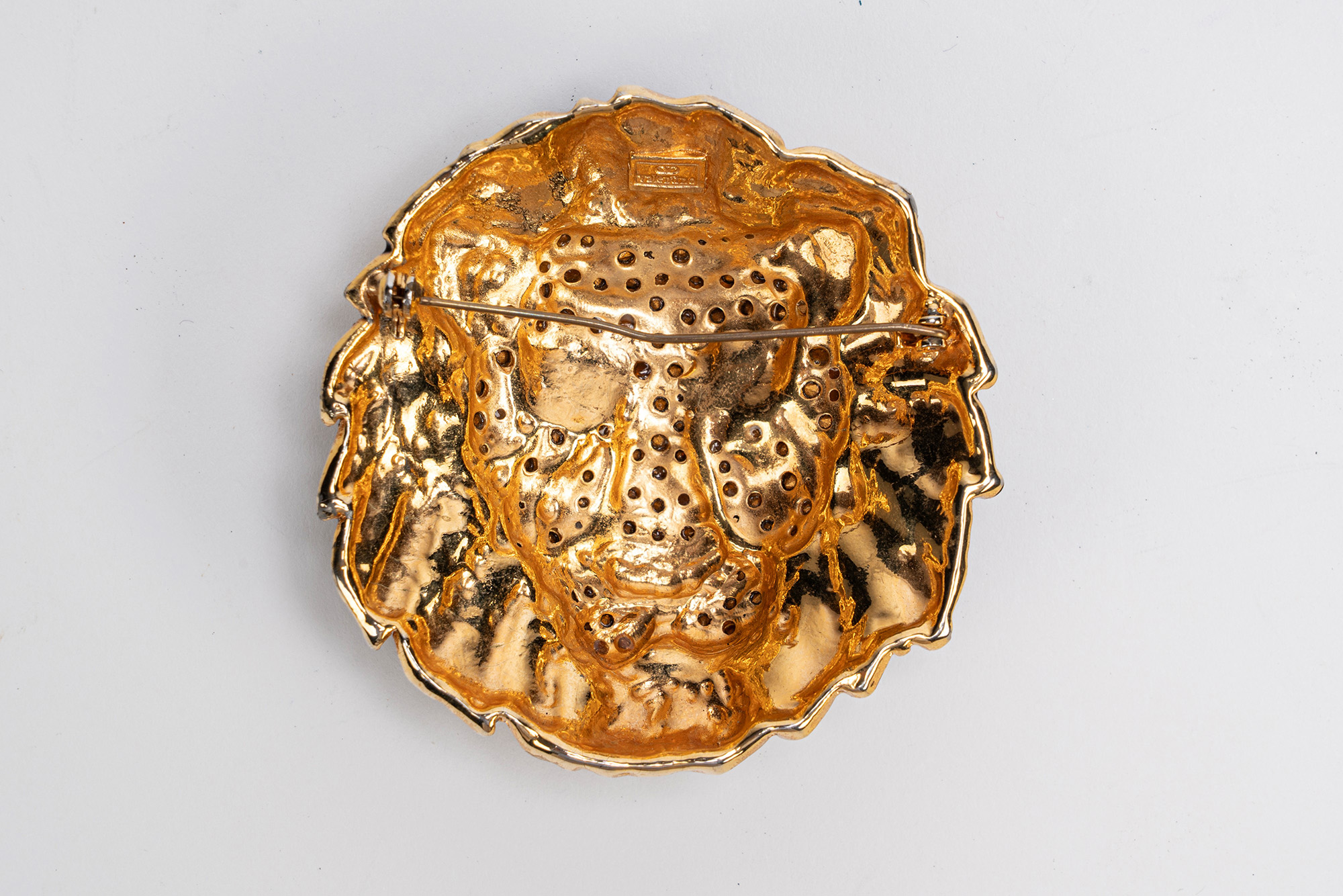 a forma di testa di leone in metallo dorato, smalto color nero e strass, dm cm 6,5 a forma di testa di leone in metallo dorato, smalto color nero e strass, dm cm 6,5