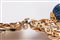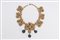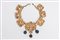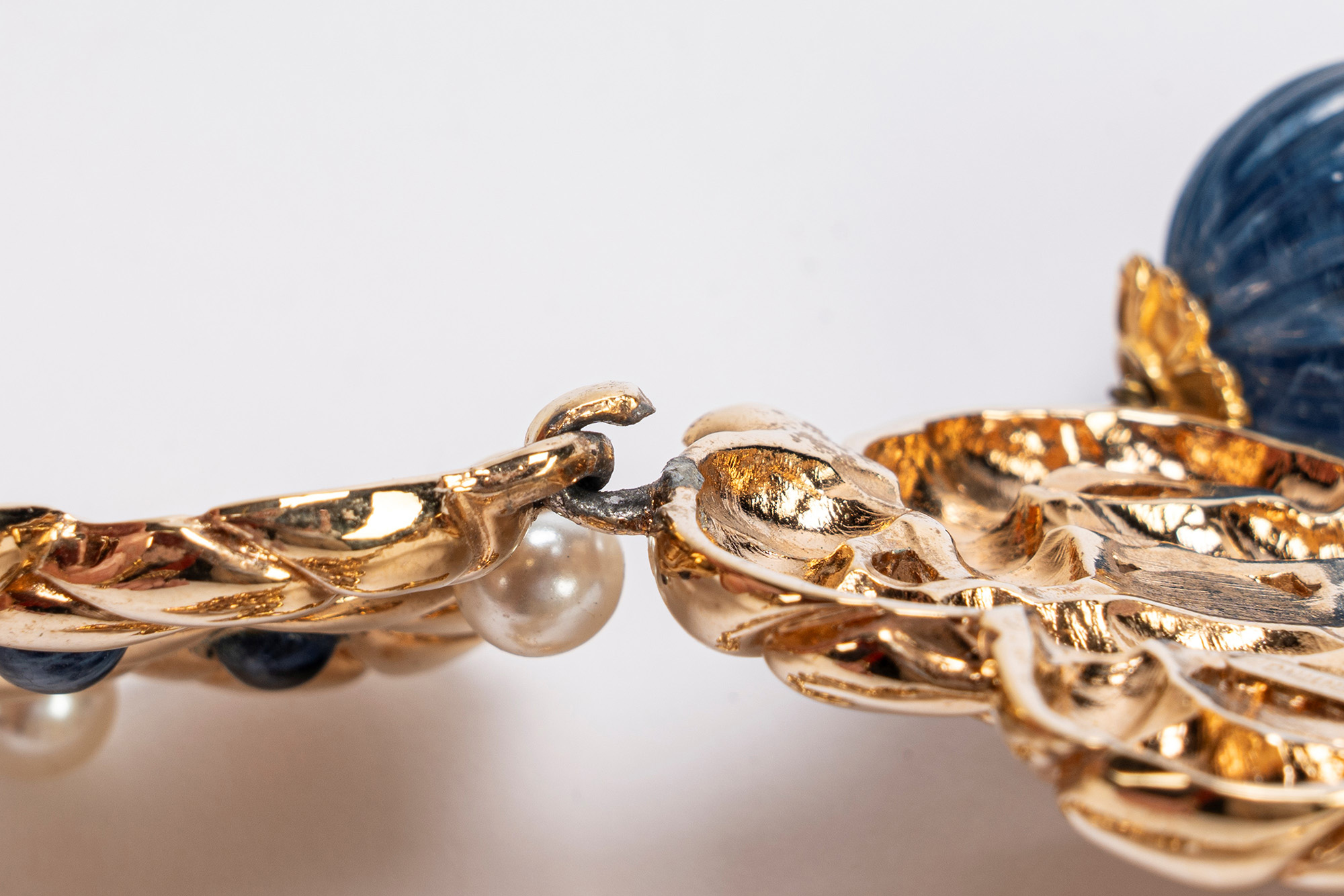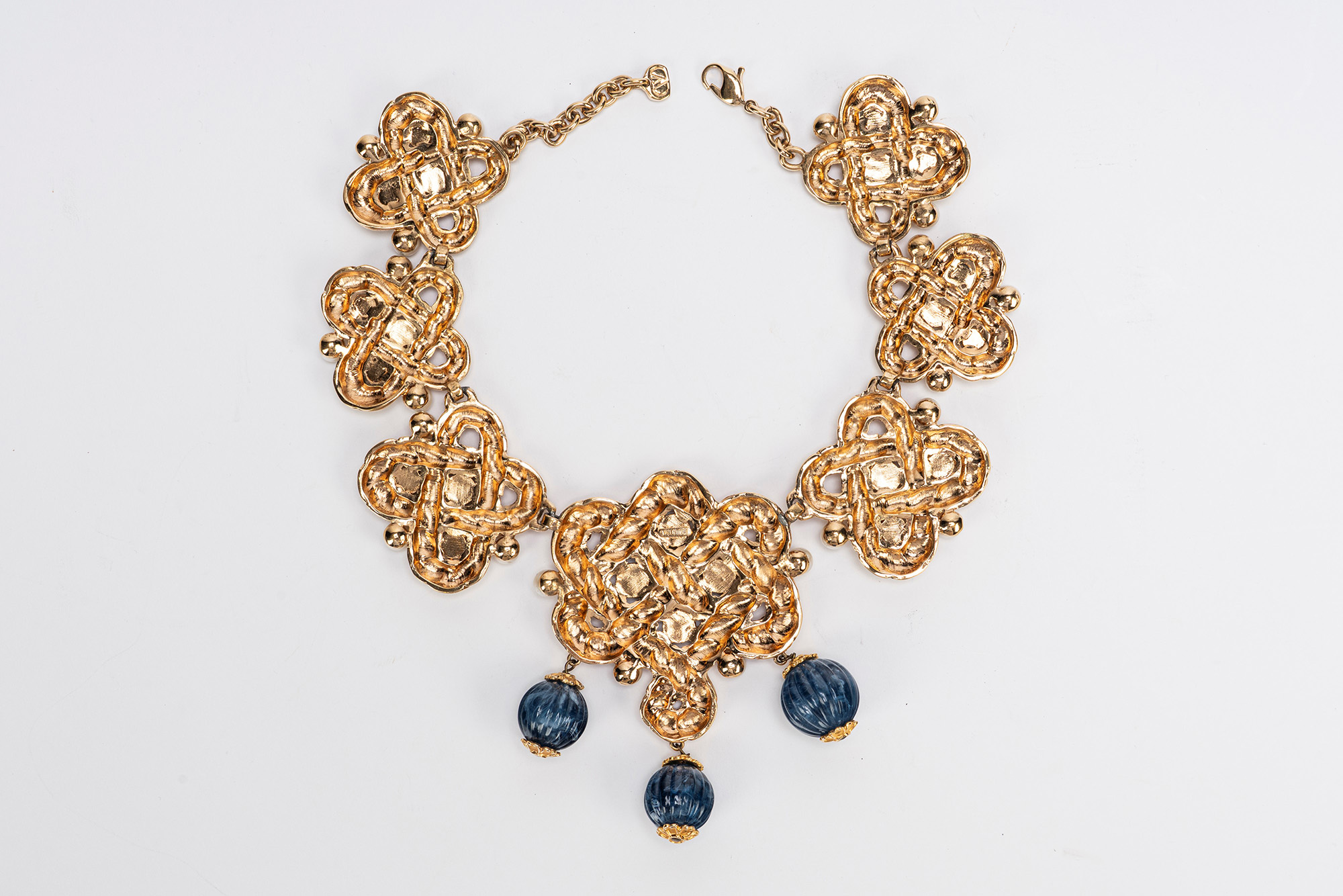 girocollo in metallo dorato, elementi a cordoncino con perle fancy e paste vitree color blu cabochon, tre boules pendenti a coste (lievissimi segni d'uso)girocollo in metallo dorato, elementi a cordoncino con perle fancy e paste vitree color blu cabochon, tre boules pendenti a coste (lievissimi segni d'uso)