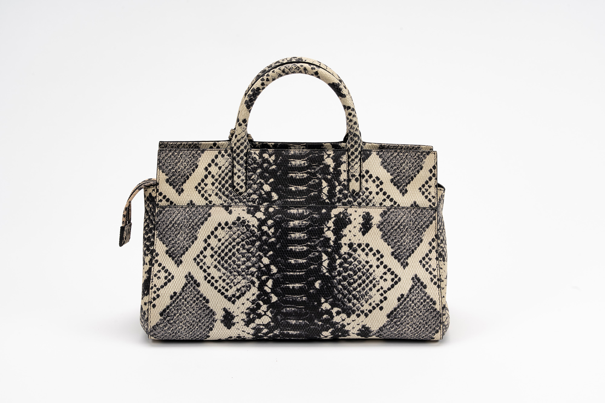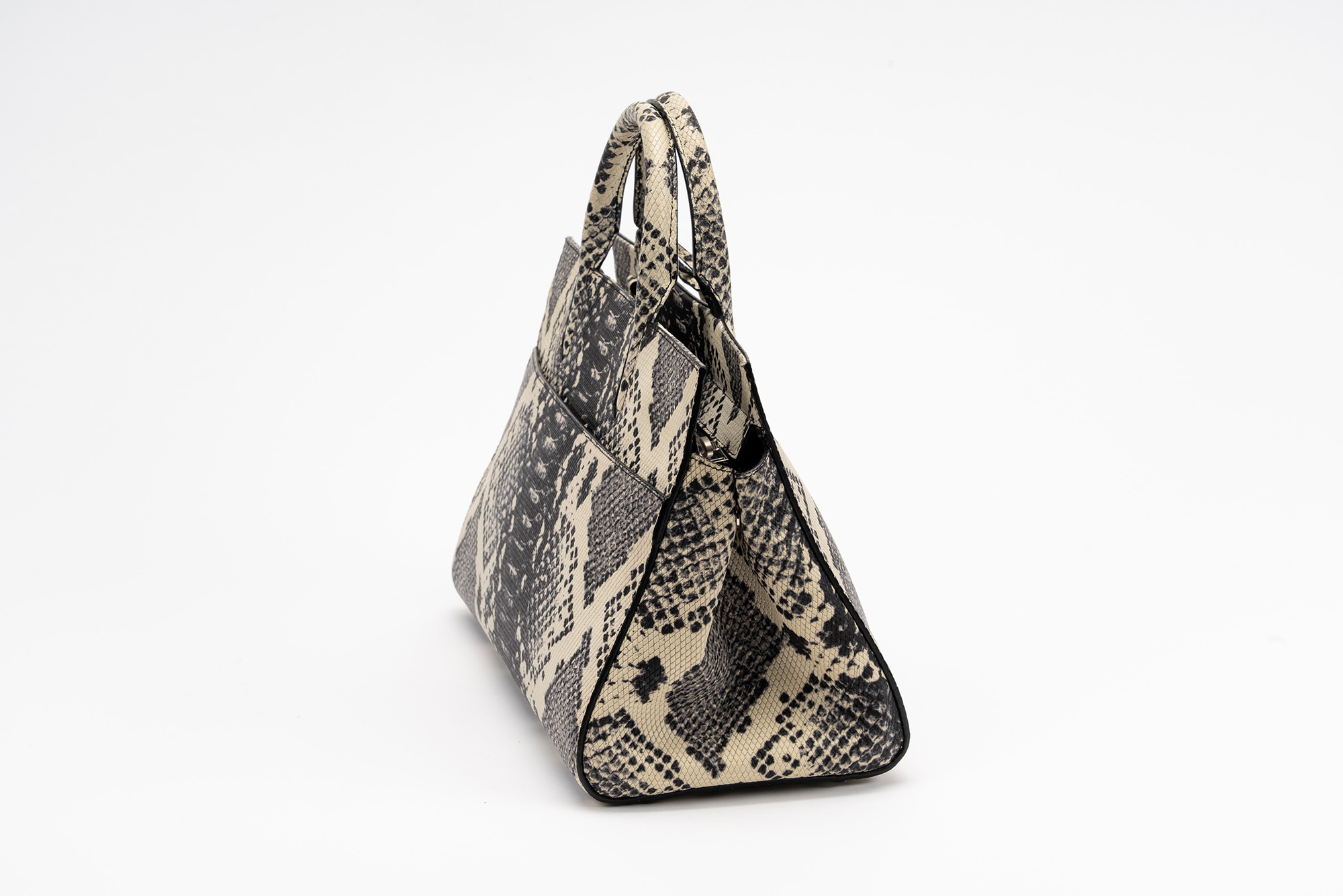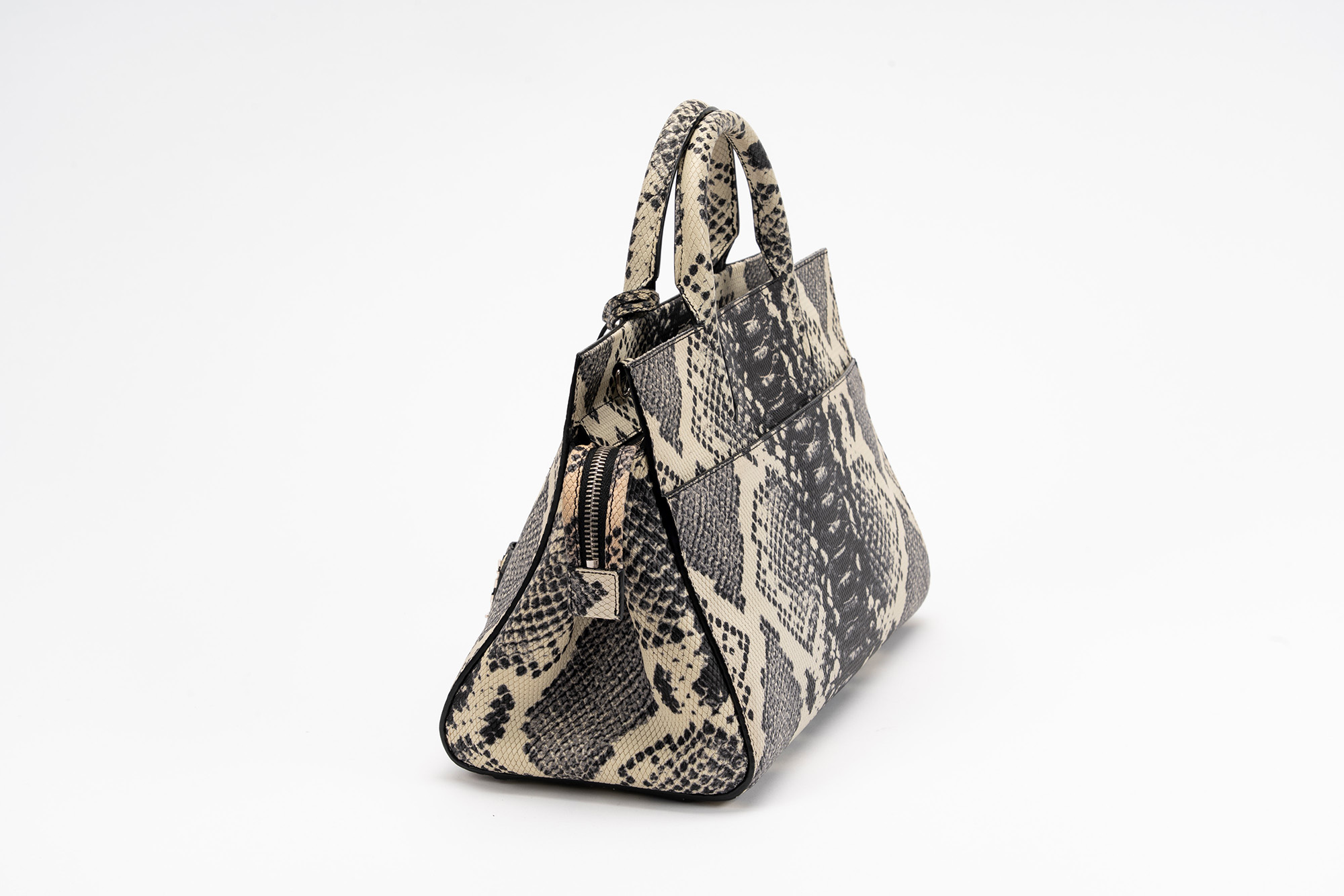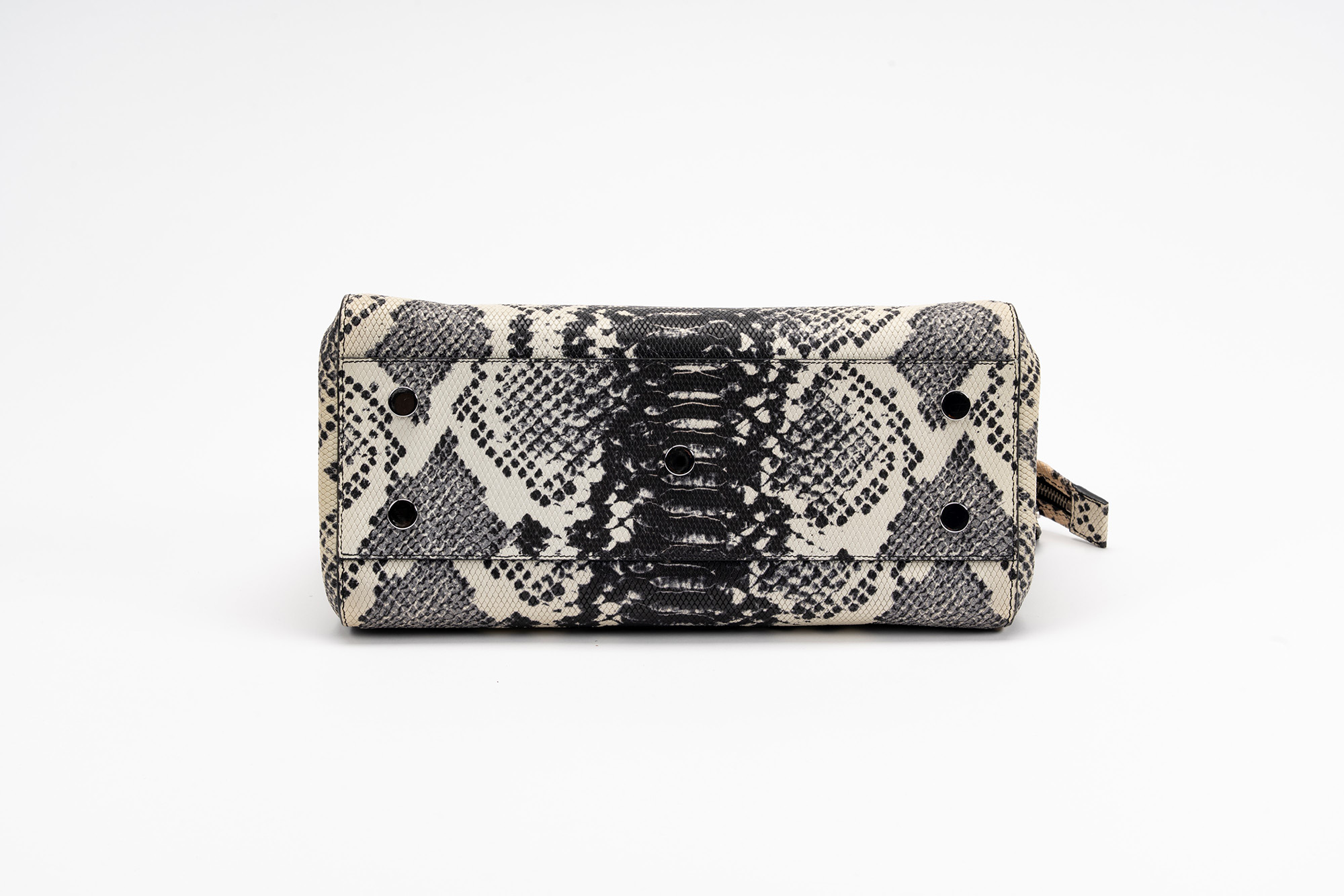 in pelle stampata color bianco e nero, dettagli in metallo, tracolla staccabile, interno in camoscio color nero, cm 30, con sacchettoin pelle stampata color bianco e nero, dettagli in metallo, tracolla staccabile, interno in camoscio color nero, cm 30, con sacchetto