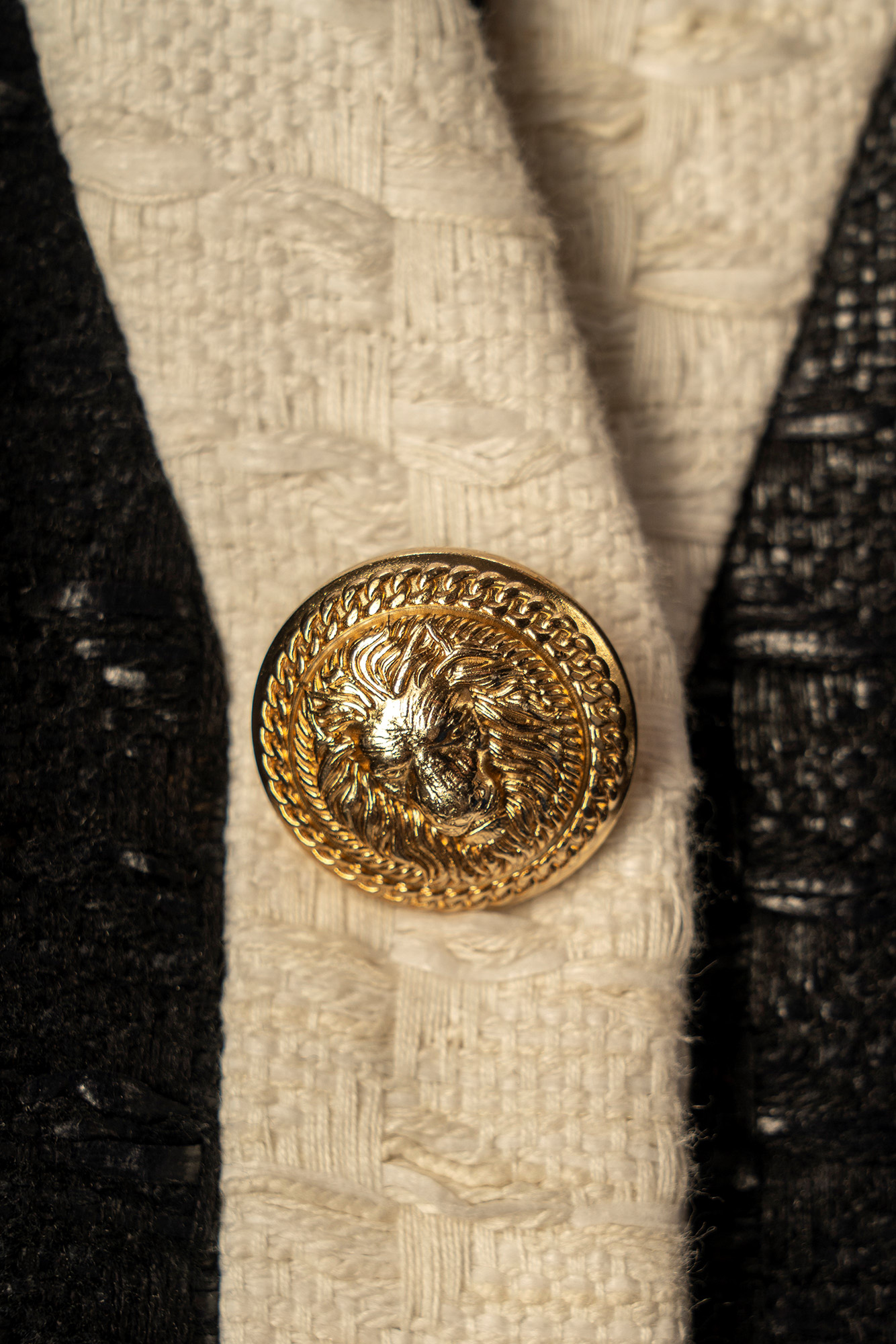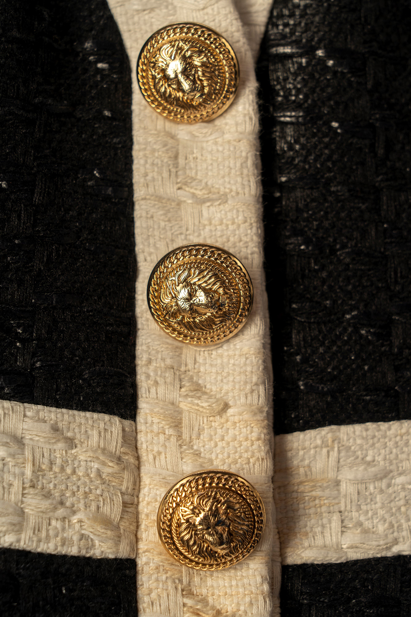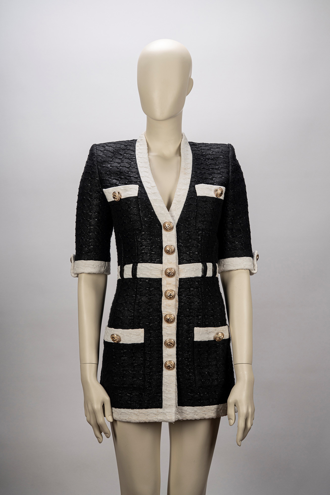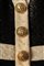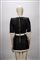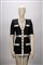 in tessuto operato misto cotone color nero, manica corta, profili color panna, bottoni gioiello in metallo dorato, chiusura a cerniera sul retro, taglia 38 (mancante di cintura)in tessuto operato misto cotone color nero, manica corta, profili color panna, bottoni gioiello in metallo dorato, chiusura a cerniera sul retro, taglia 38 (mancante di cintura)