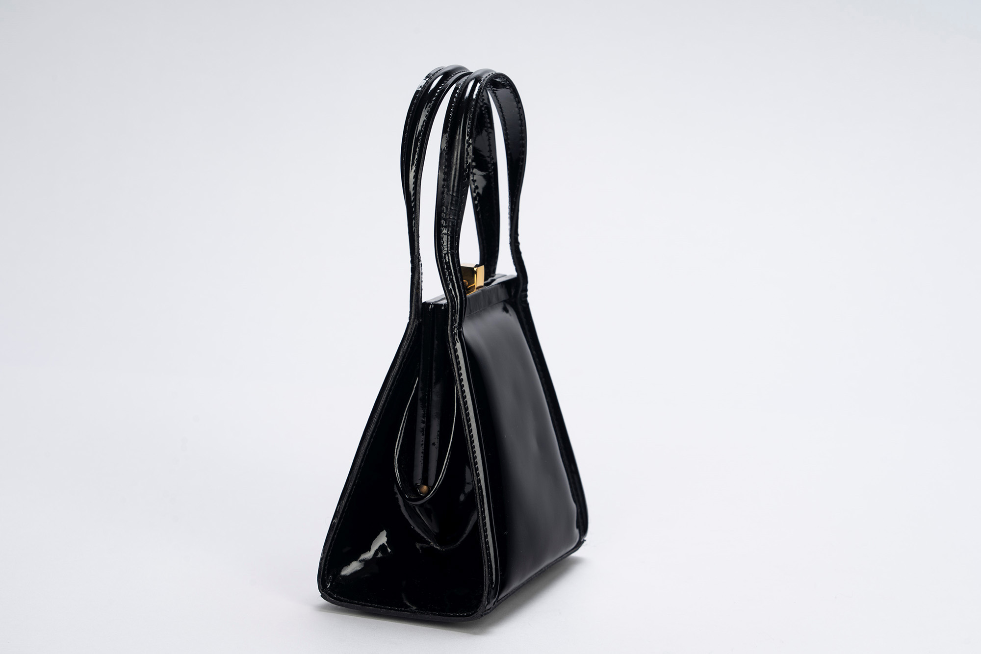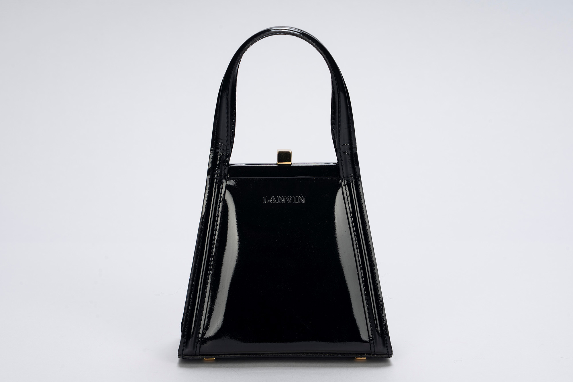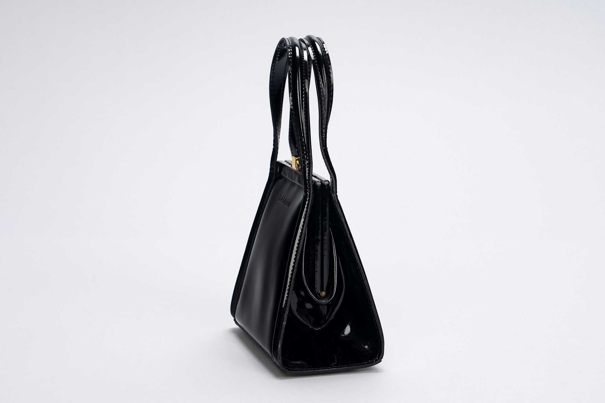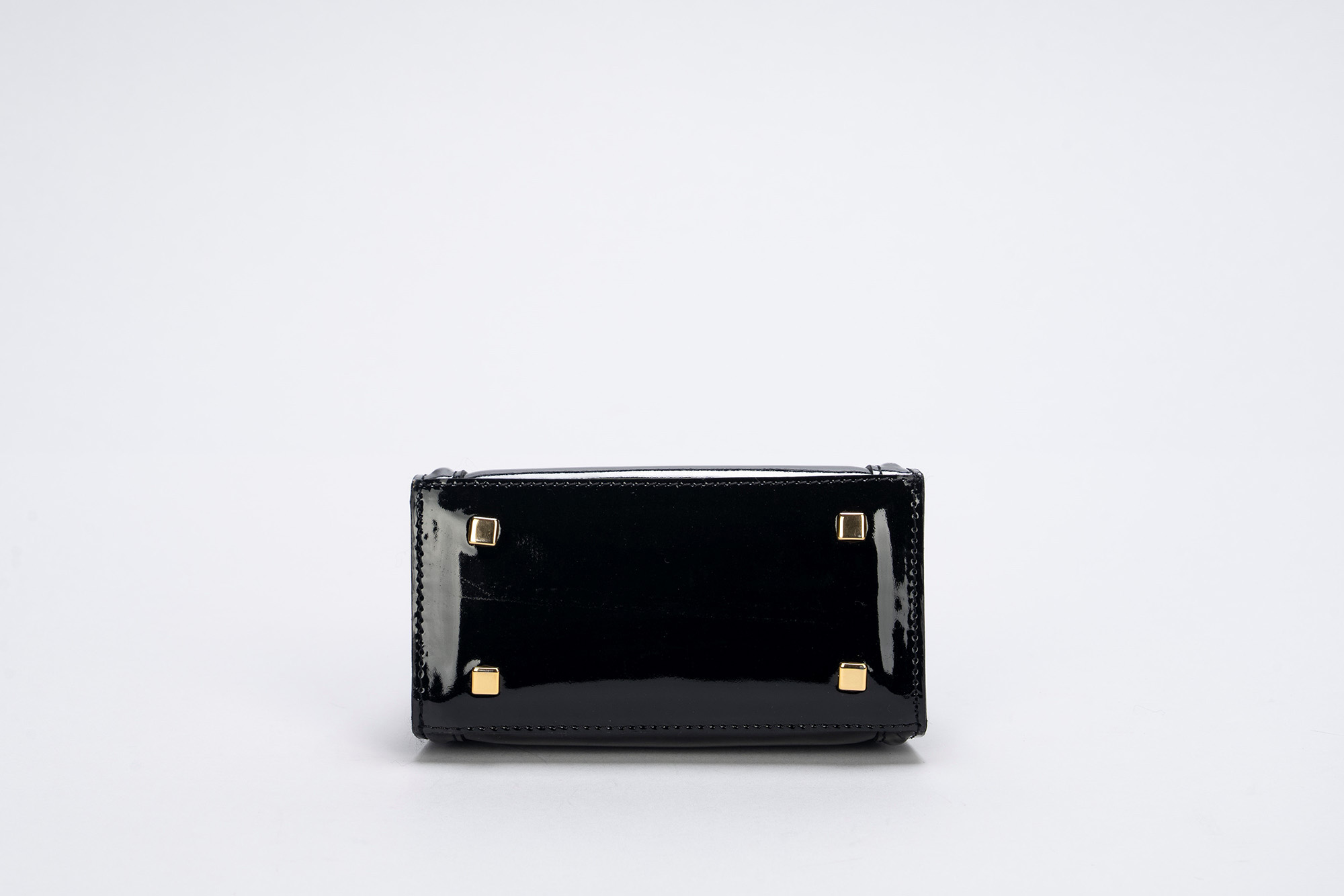 in vernice color nero, dettagli in metallo dorato, tracolla staccabile, cm 15, con sacchetto (lievissimi segni d'uso)in vernice color nero, dettagli in metallo dorato, tracolla staccabile, cm 15, con sacchetto (lievissimi segni d'uso)