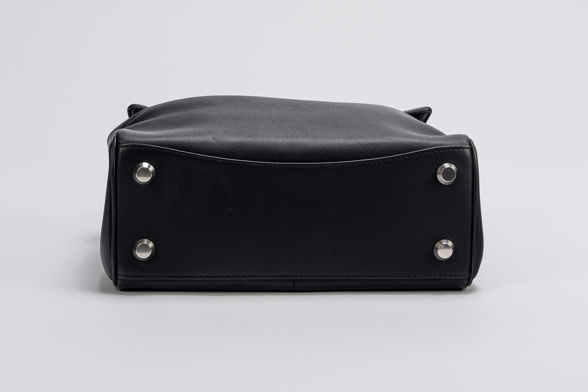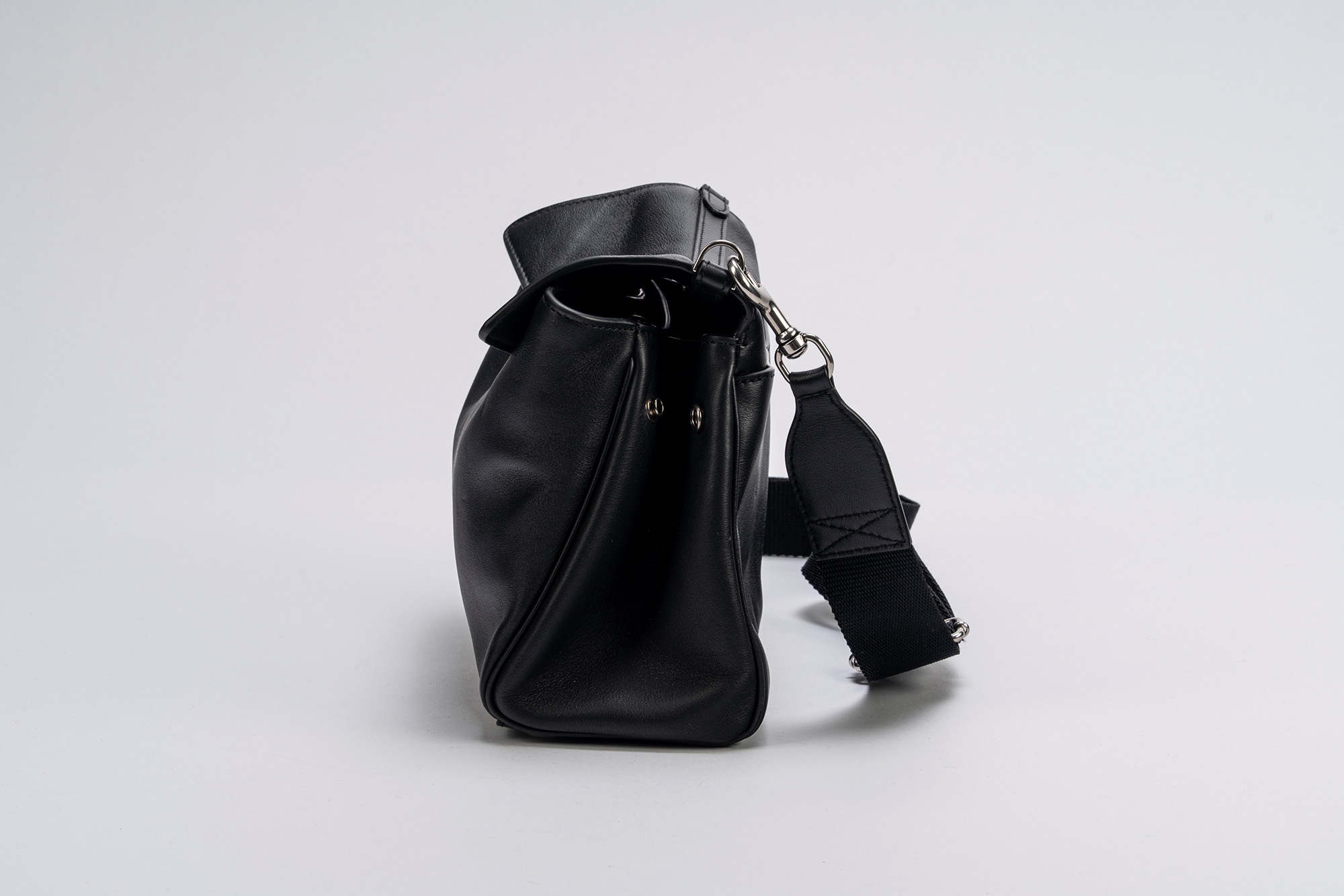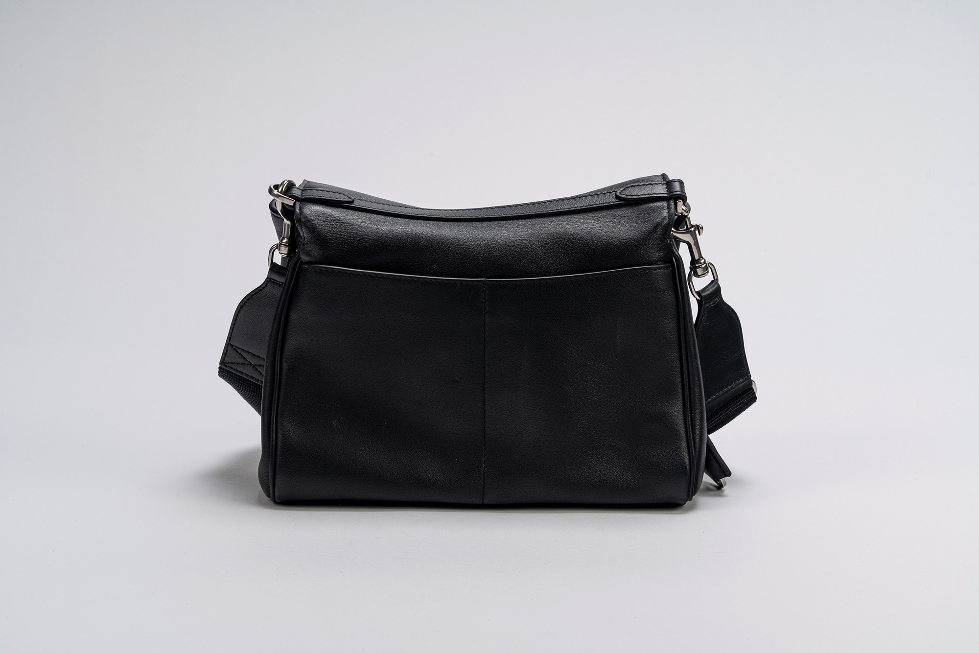 in pelle color nero, con tracolla staccabile e regolabile in tessuto, dettagli in metallo, cm 25, con sacchetto (lievi segni d'uso)in pelle color nero, con tracolla staccabile e regolabile in tessuto, dettagli in metallo, cm 25, con sacchetto (lievi segni d'uso)