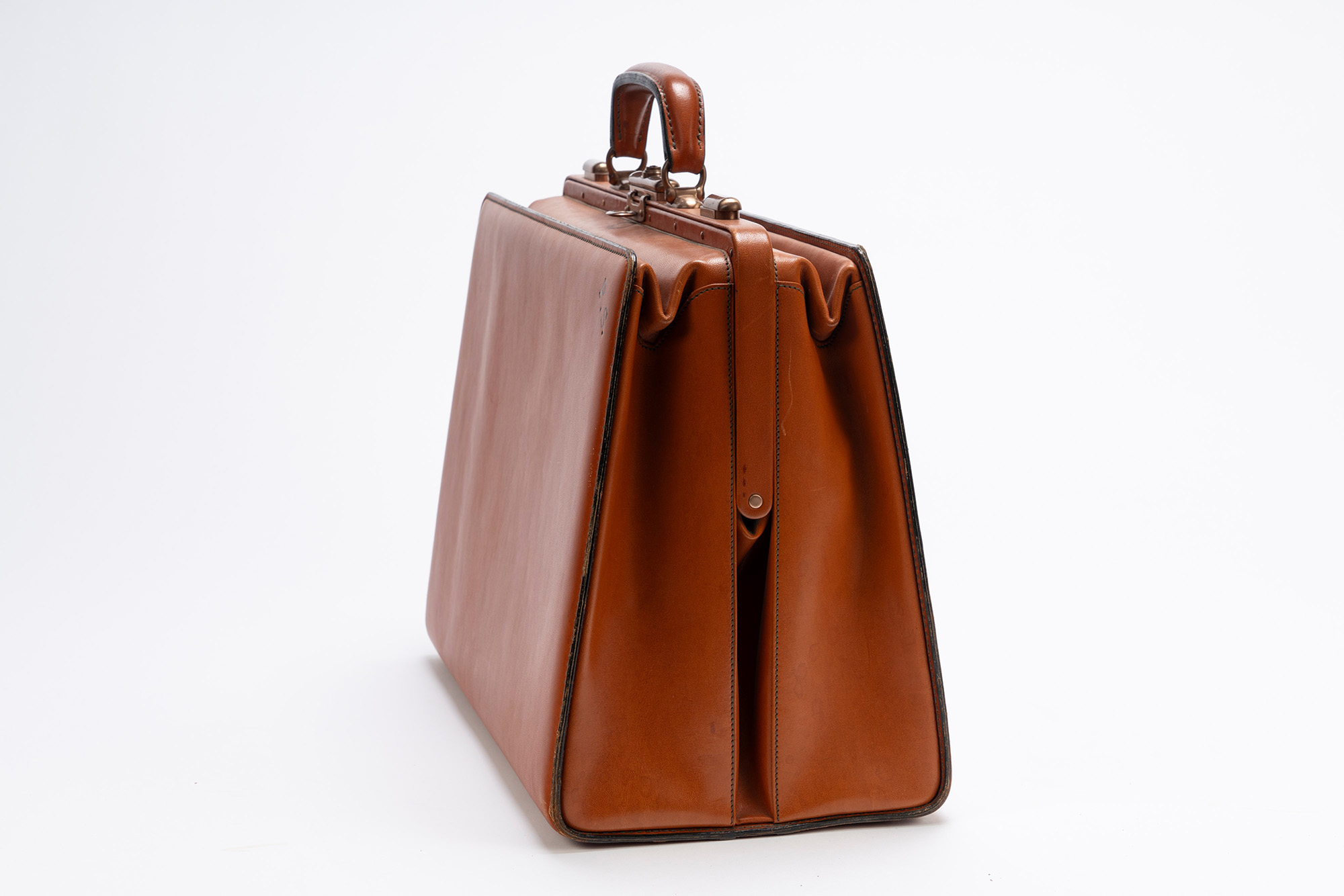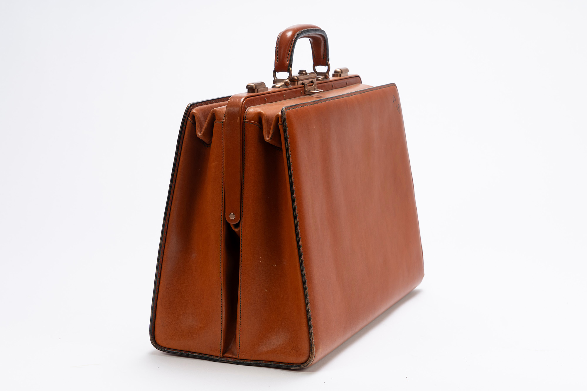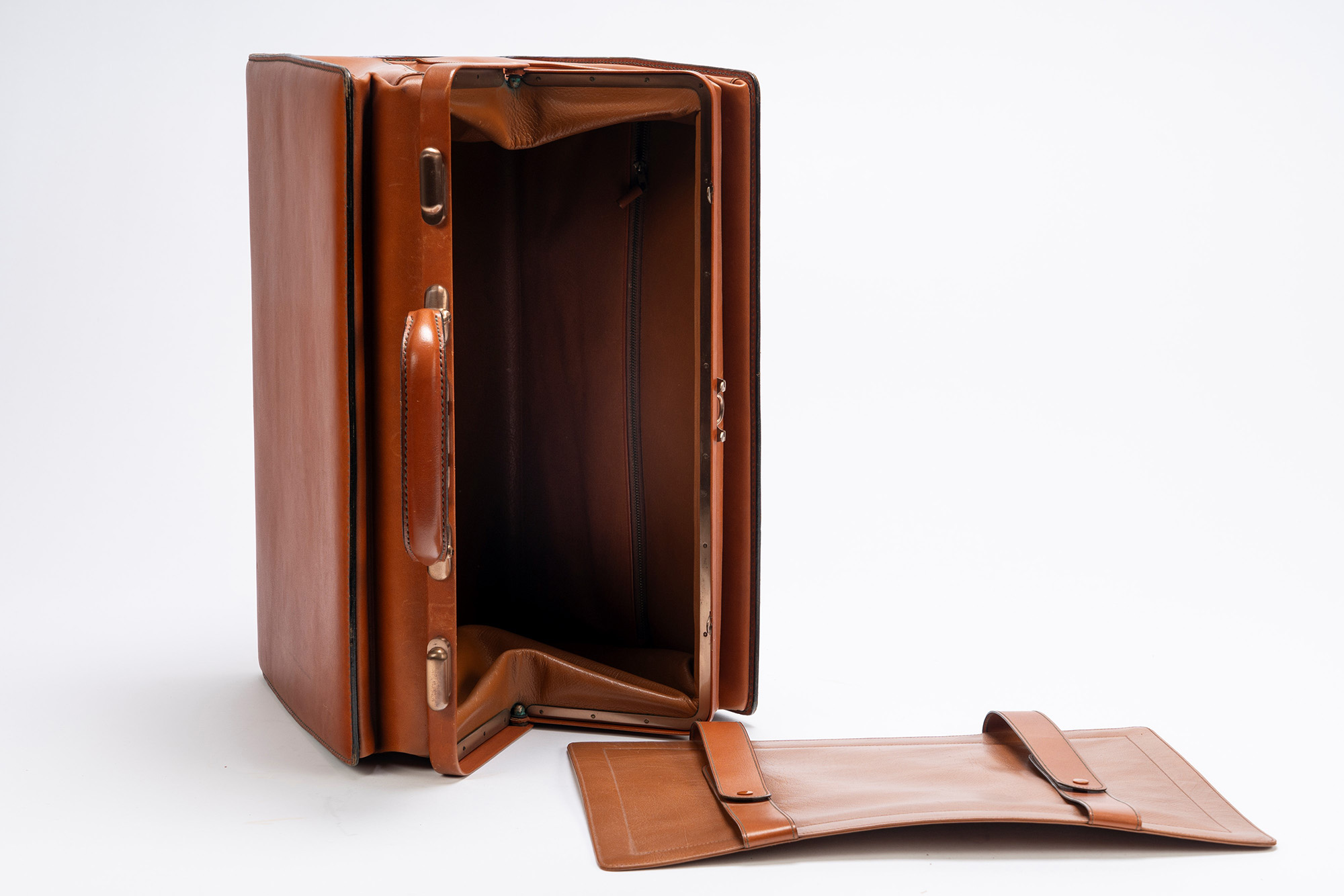 in cuoio, dettagli in metallo brunito, interno in pelle, iniziali P.S., cm 44 x 21 x 30 (lievi segni d'uso)in cuoio, dettagli in metallo brunito, interno in pelle, iniziali P.S., cm 44 x 21 x 30 (lievi segni d'uso)