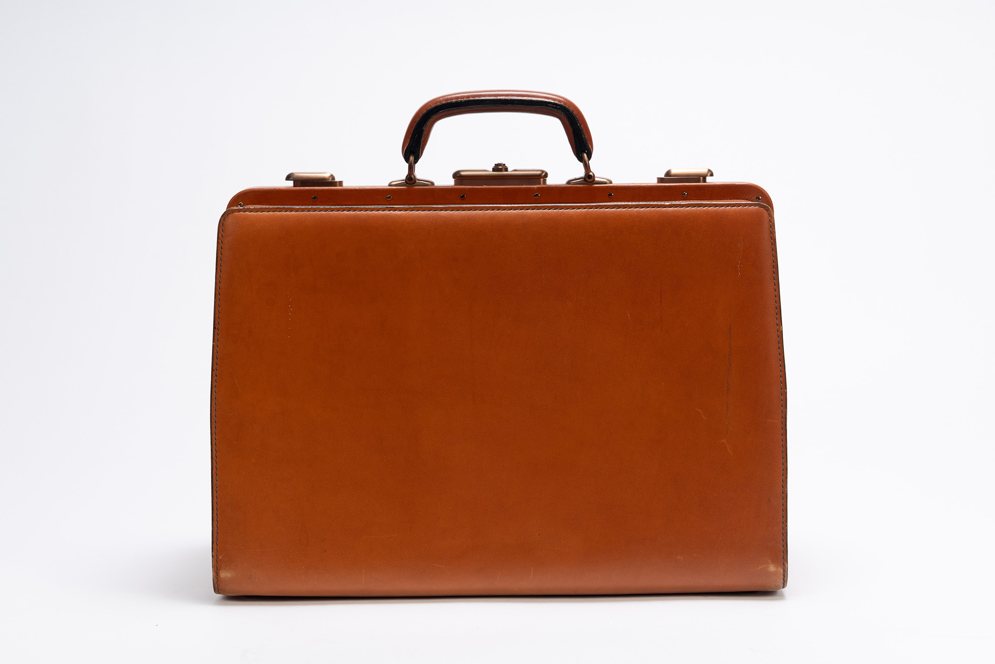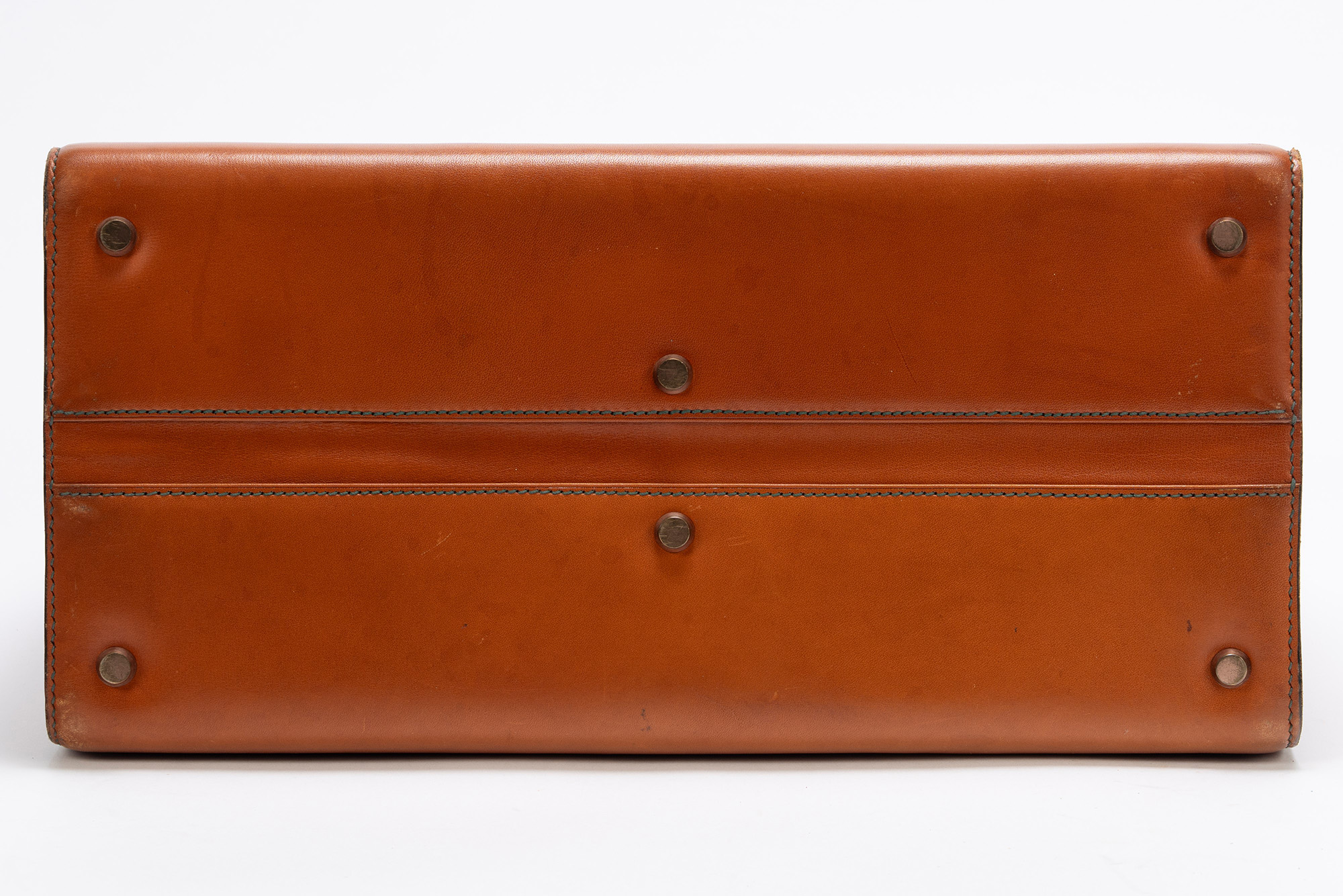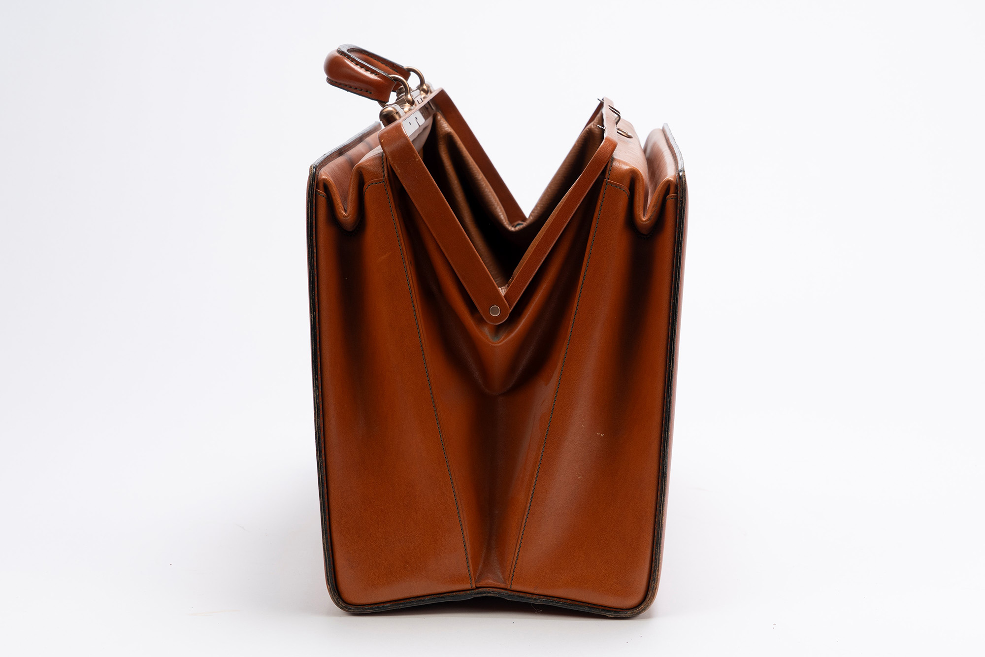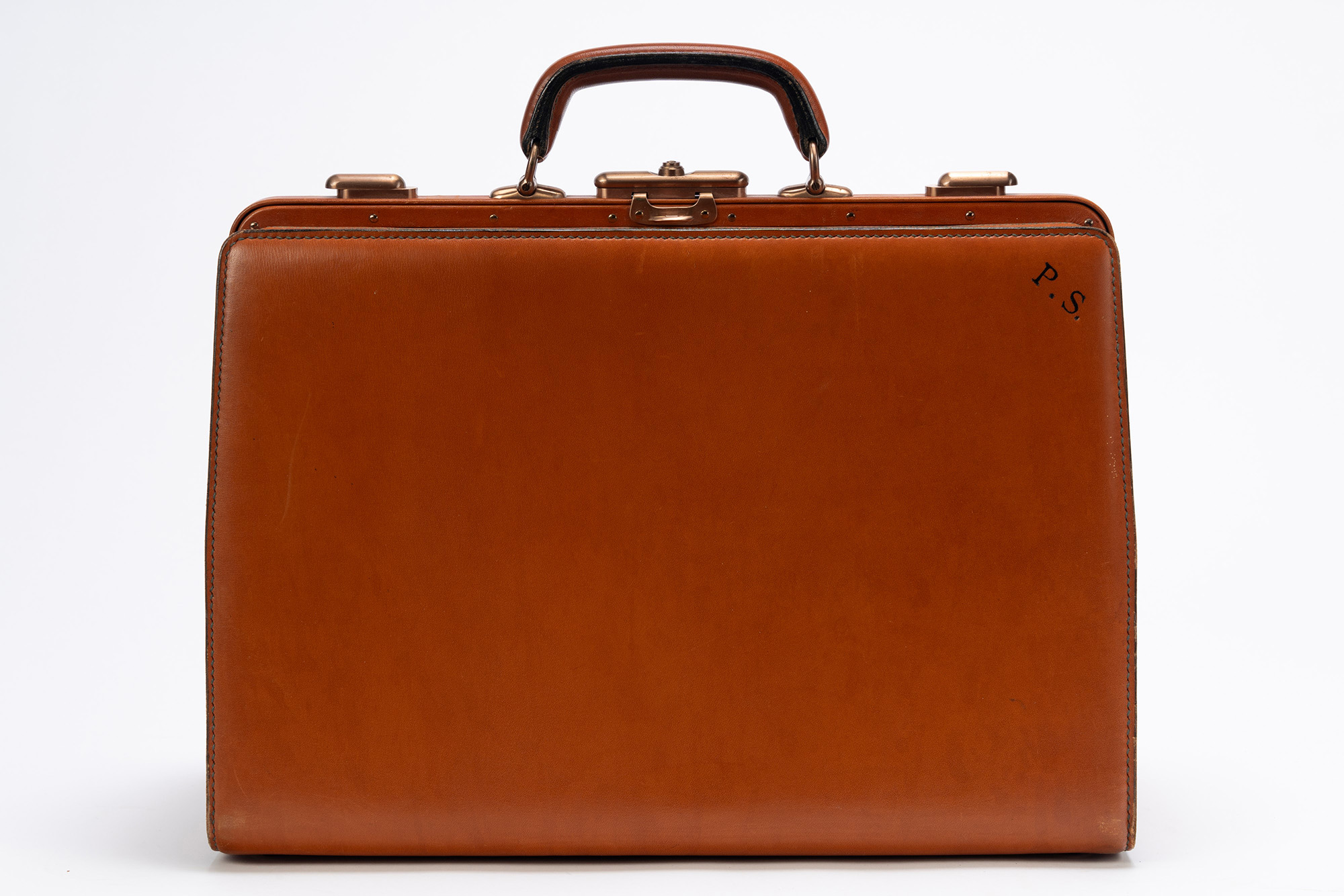 in cuoio, dettagli in metallo brunito, interno in pelle, iniziali P.S., cm 44 x 21 x 30 (lievi segni d'uso)in cuoio, dettagli in metallo brunito, interno in pelle, iniziali P.S., cm 44 x 21 x 30 (lievi segni d'uso)