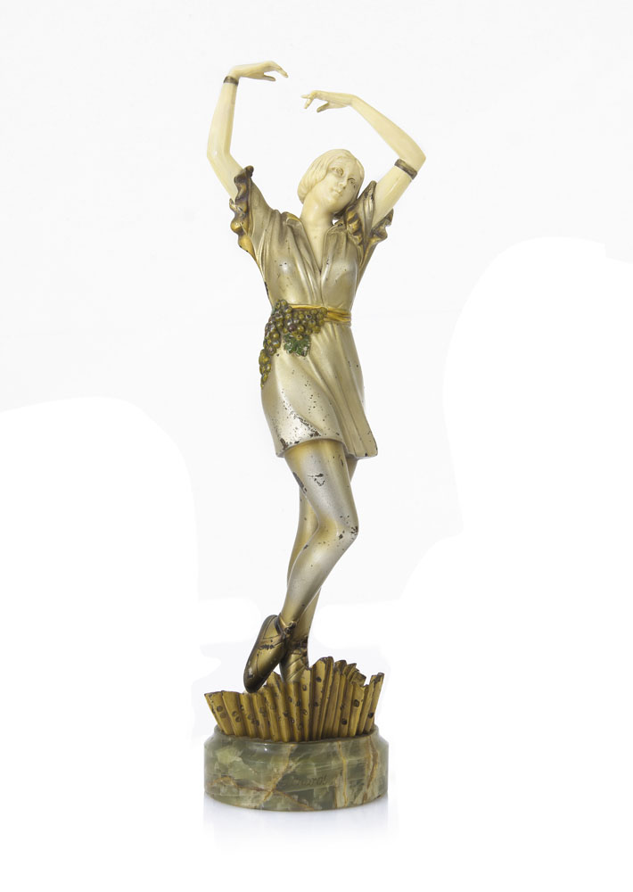 Metallo smaltato e avorio su base in onice, firma incisa, alt. totale cm 35,7; usure e mancanze.