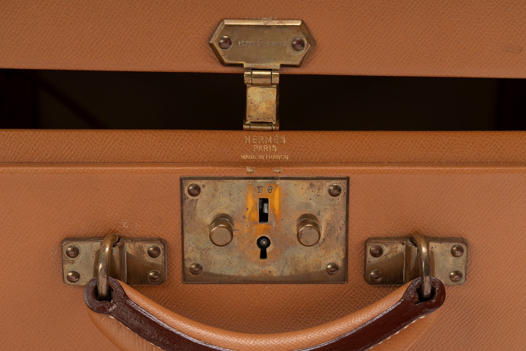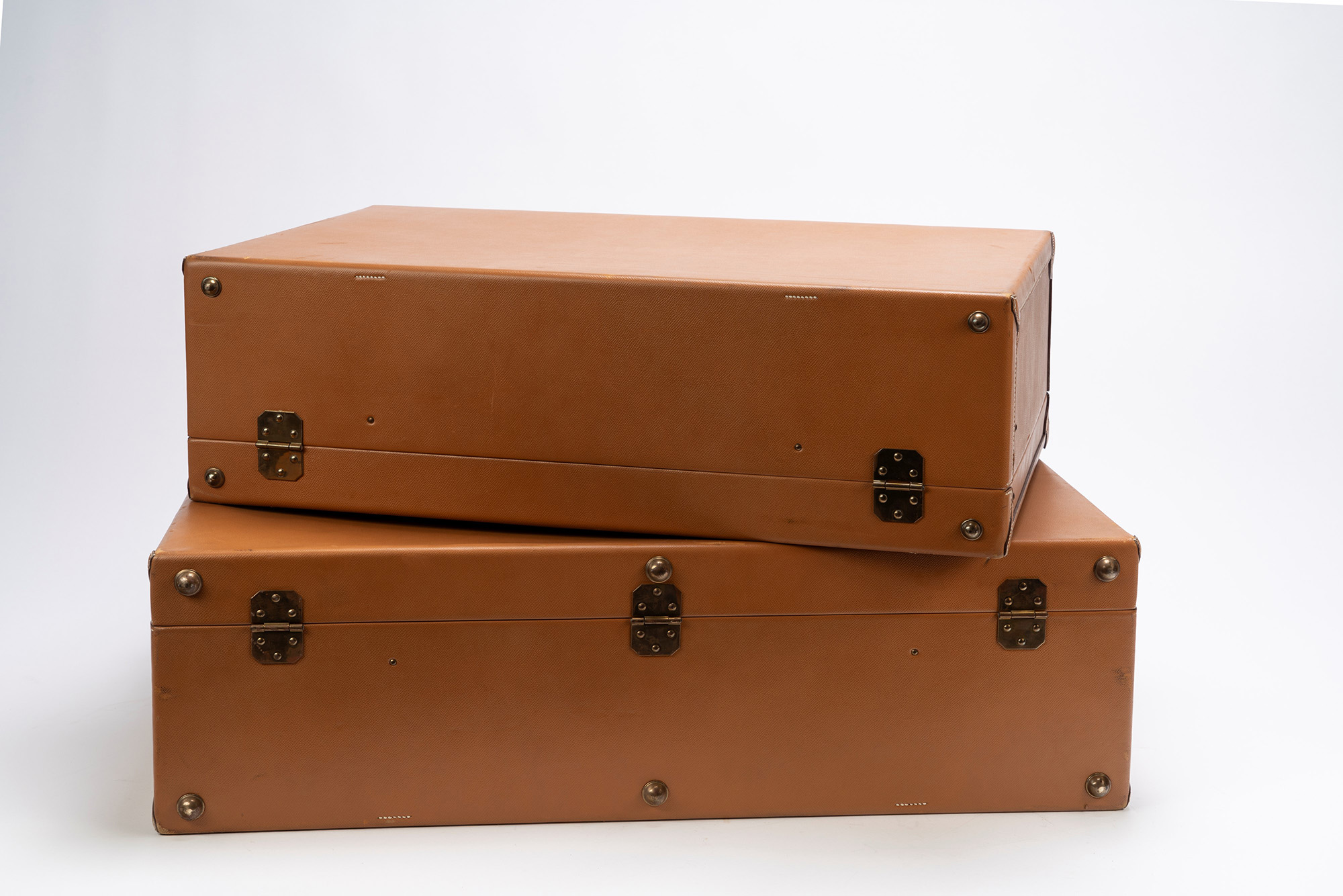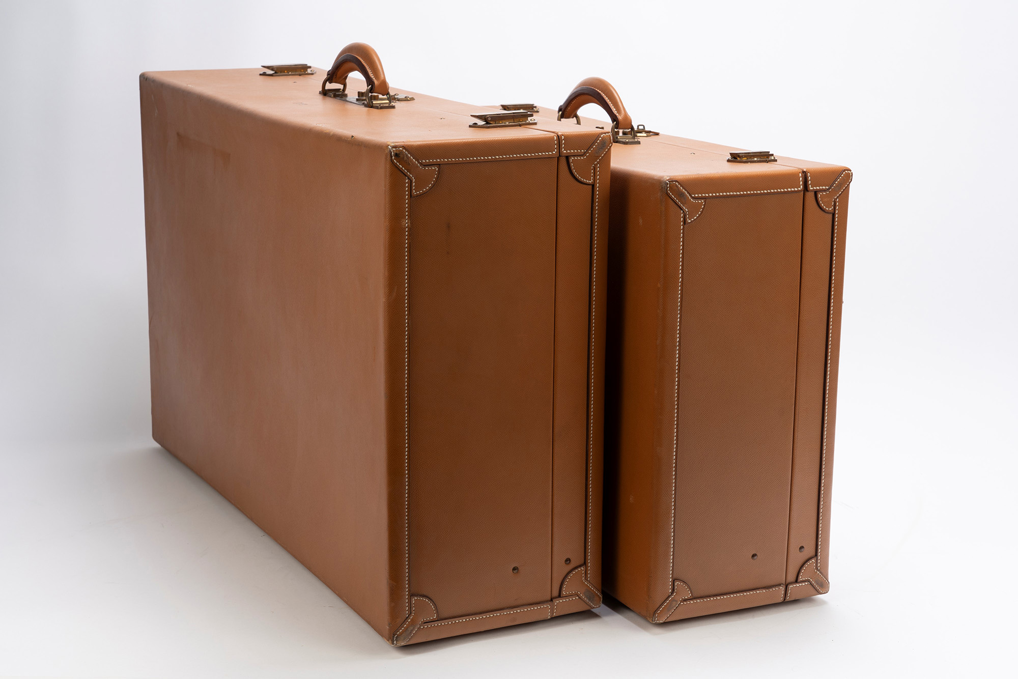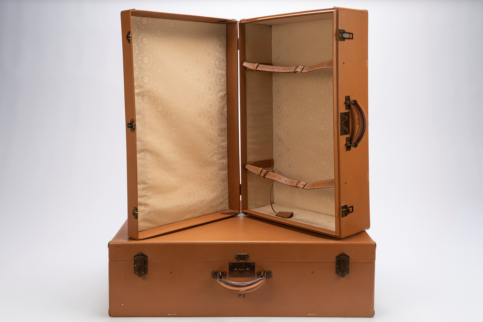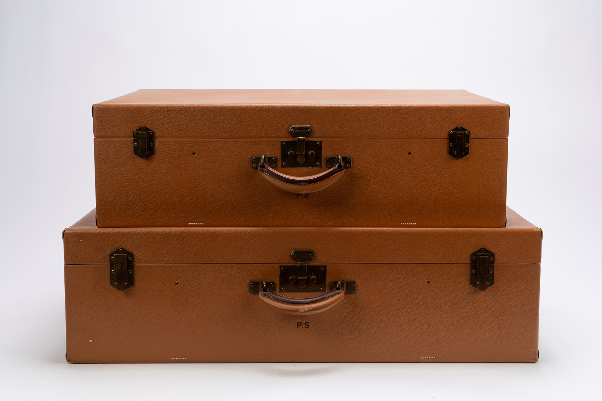 Misure: cm 80 x 23 x 50 e cm 70 x 21 x 45 in pelle, dettagli in ottone, interno rivestito in tessuto color miele con logo, iniziali P.S. (segni d'uso)