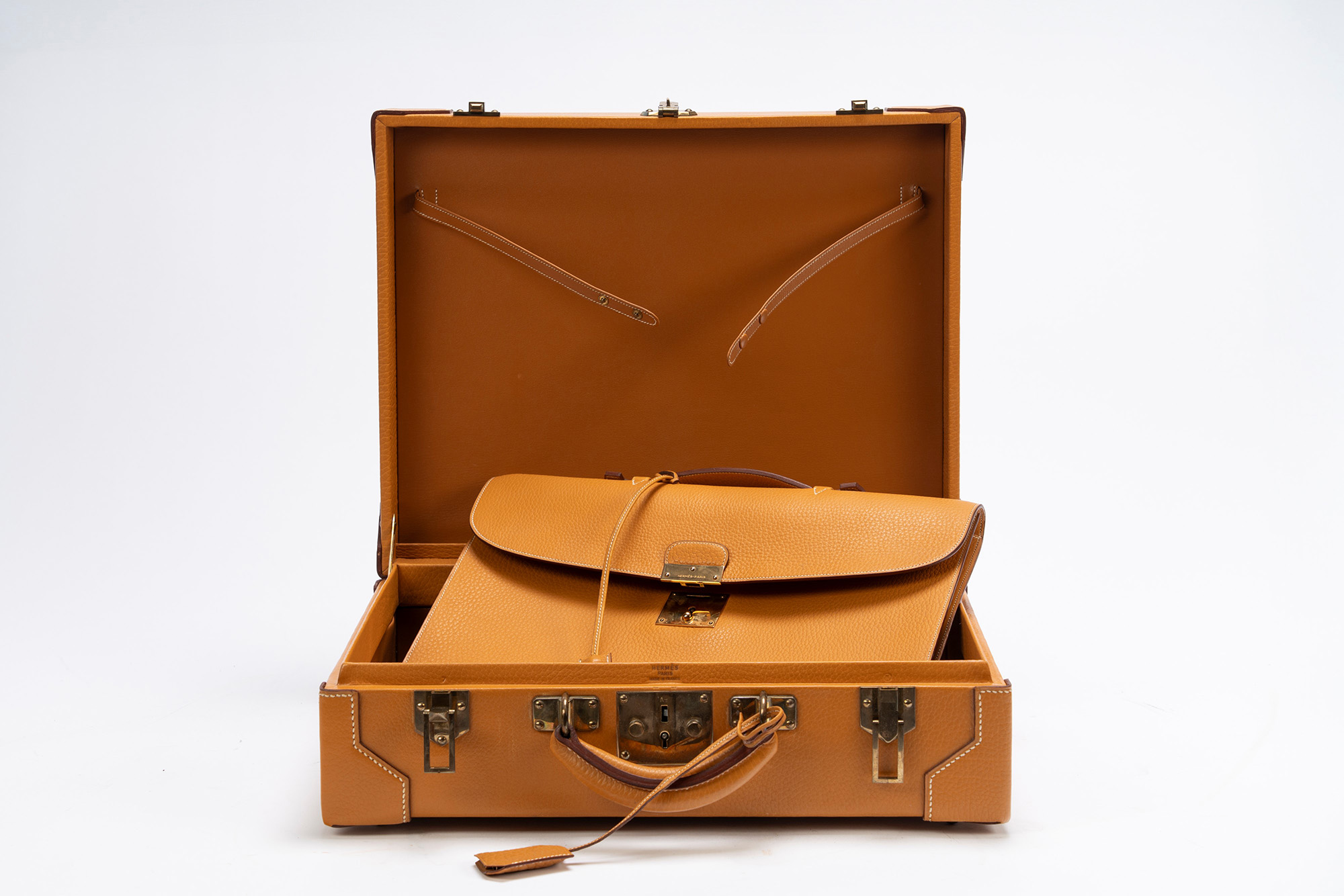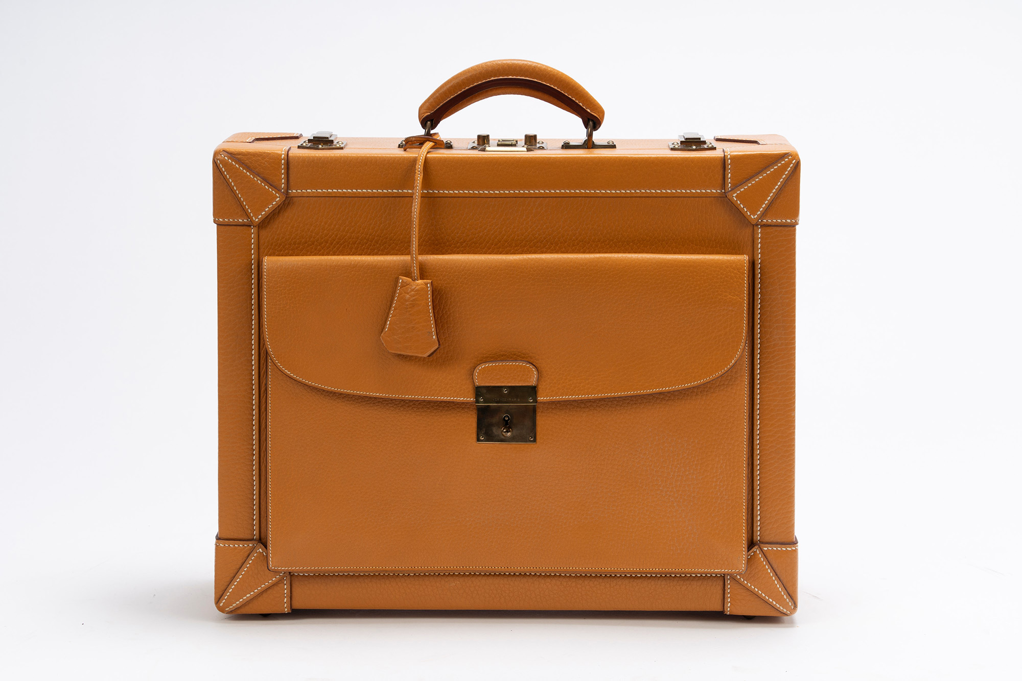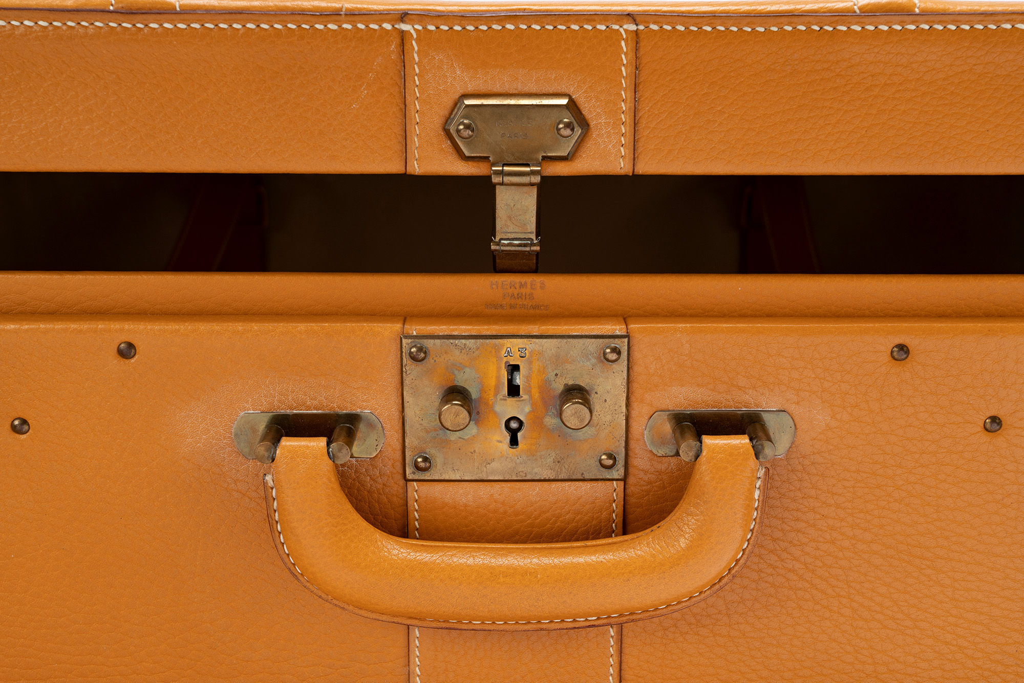 in pelle, dettagli in ottone, interno rivestito in tessuto logato color miele, valigetta con cartella interna staccabile, iniziali P.S. (segni d'uso)