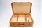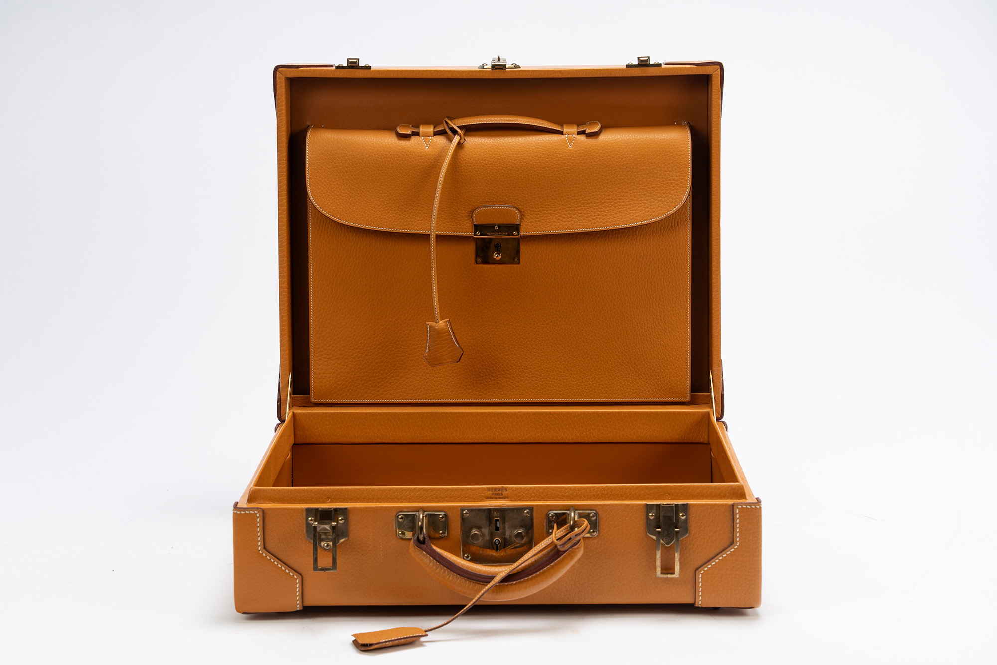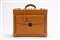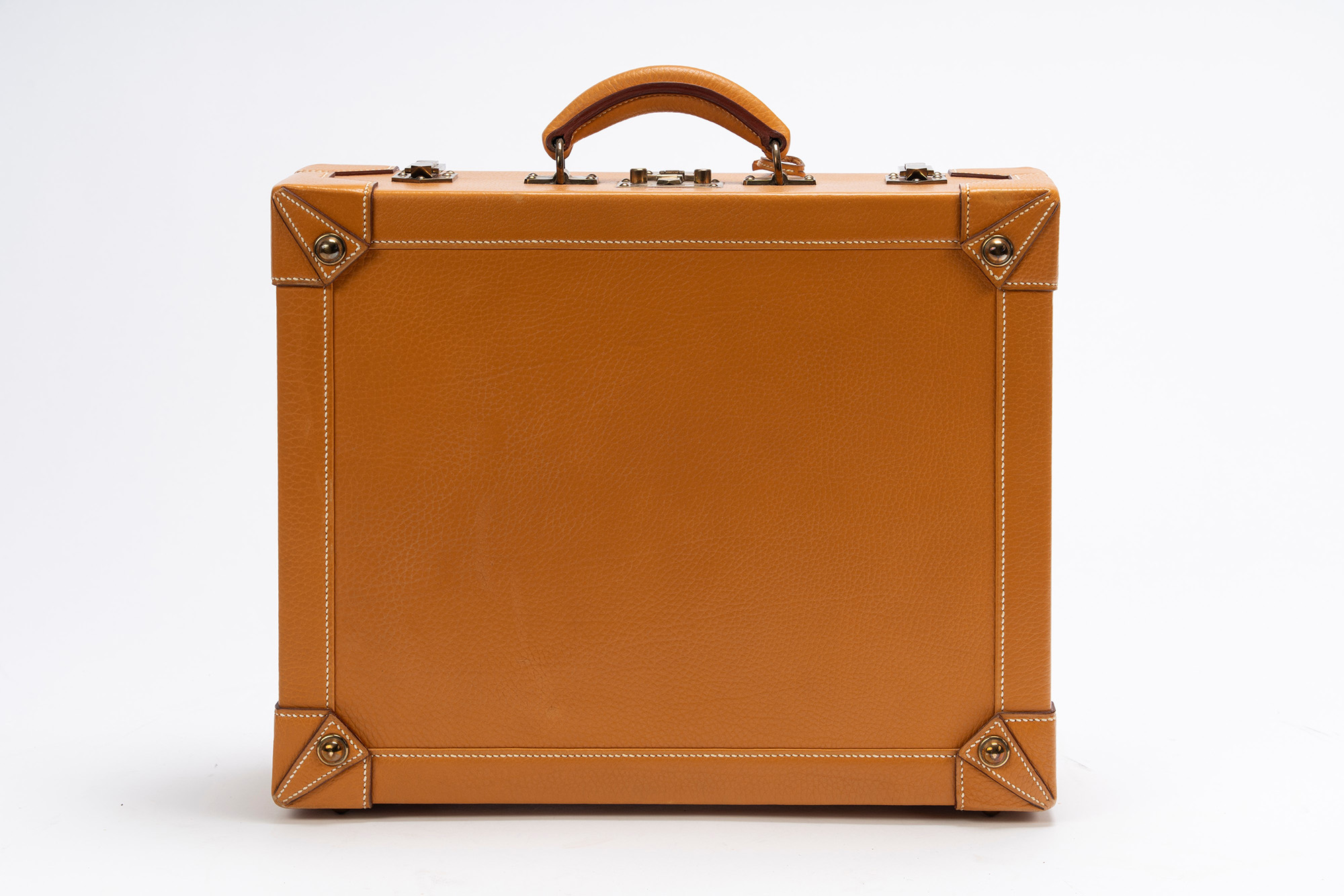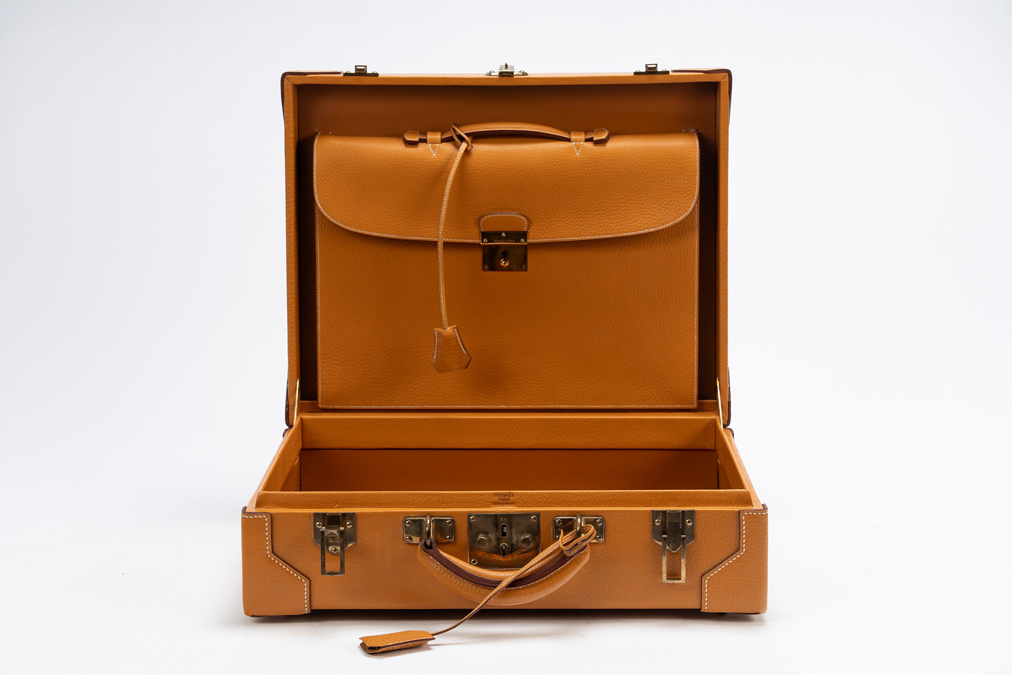 in pelle, dettagli in ottone, interno rivestito in tessuto logato color miele, valigetta con cartella interna staccabile, iniziali P.S. (segni d'uso)
