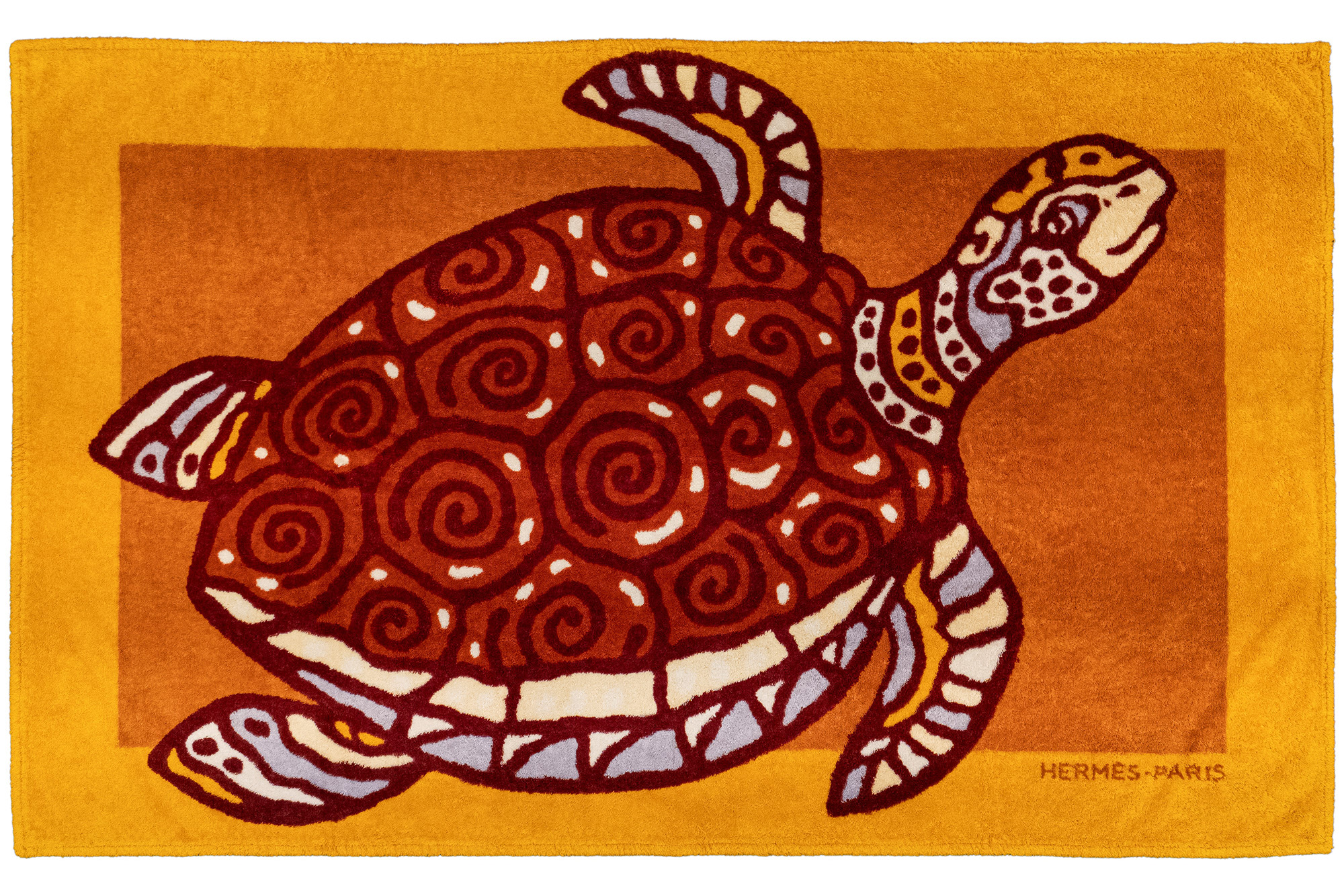 in spugna di cotone, stampa tartaruga colori vari, bordo color arancione, cm 140 x 90 (lievissimi segni d'uso)in spugna di cotone, stampa tartaruga colori vari, bordo color arancione, cm 140 x 90 (lievissimi segni d'uso)