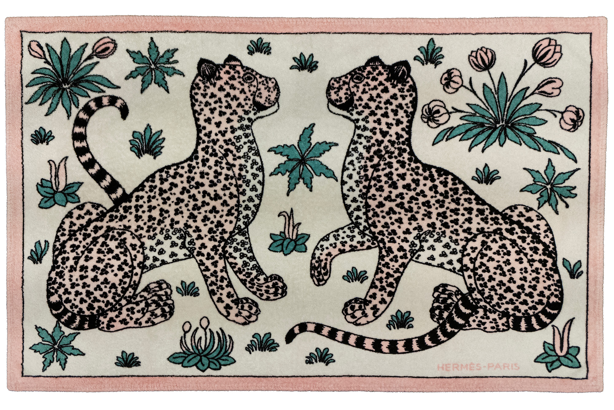 in spugna di cotone, stampa ghepardi in colori vari, bordo color rosa, cm 150 x 95 (lievi segni d'uso)in spugna di cotone, stampa ghepardi in colori vari, bordo color rosa, cm 150 x 95 (lievi segni d'uso)