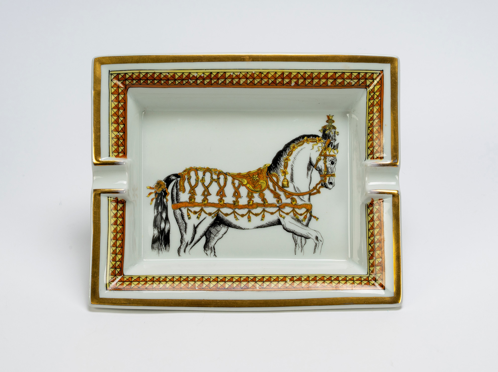 in porcellana bianca con decoro cavallo in colori vari, bordo color oro, cm 19 x 16 (lievi segni d'uso)in porcellana bianca con decoro cavallo in colori vari, bordo color oro, cm 19 x 16 (lievi segni d'uso)