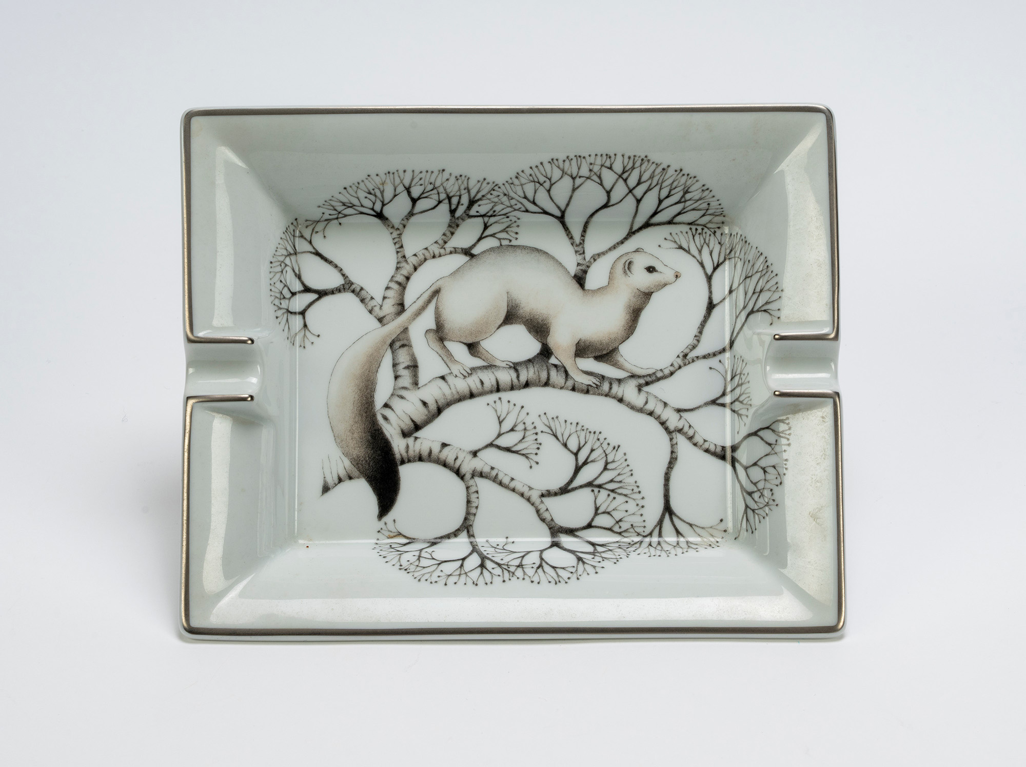 in porcellana bianca con decoro ermellino bianco, bordo color argento, cm 19,5 x 16 in porcellana bianca con decoro ermellino bianco, bordo color argento, cm 19,5 x 16