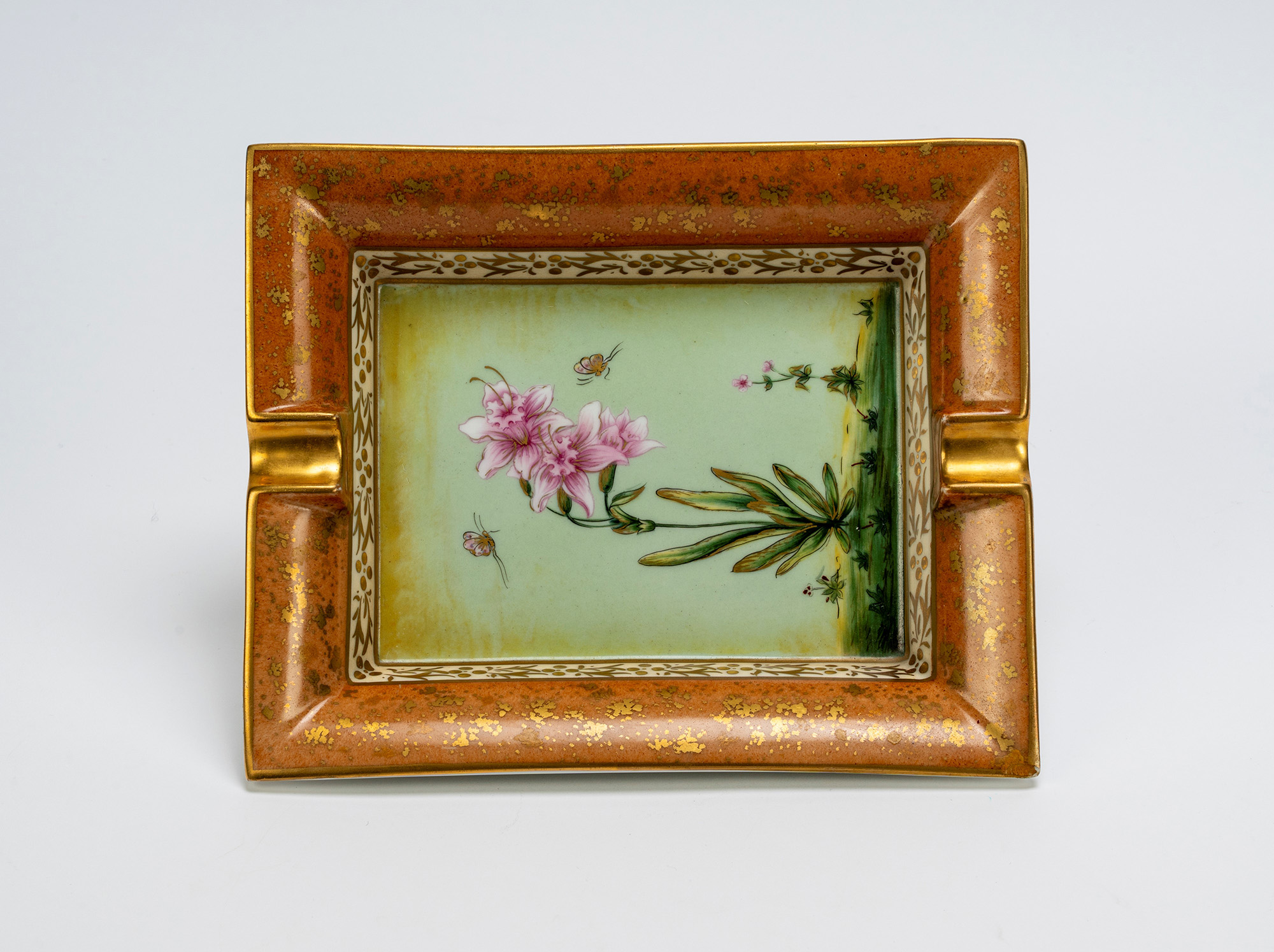 in porcellana bianca con decoro floreale su fondo color verde chiaro, bordo con spot color oro (segni d'uso)in porcellana bianca con decoro floreale su fondo color verde chiaro, bordo con spot color oro (segni d'uso)