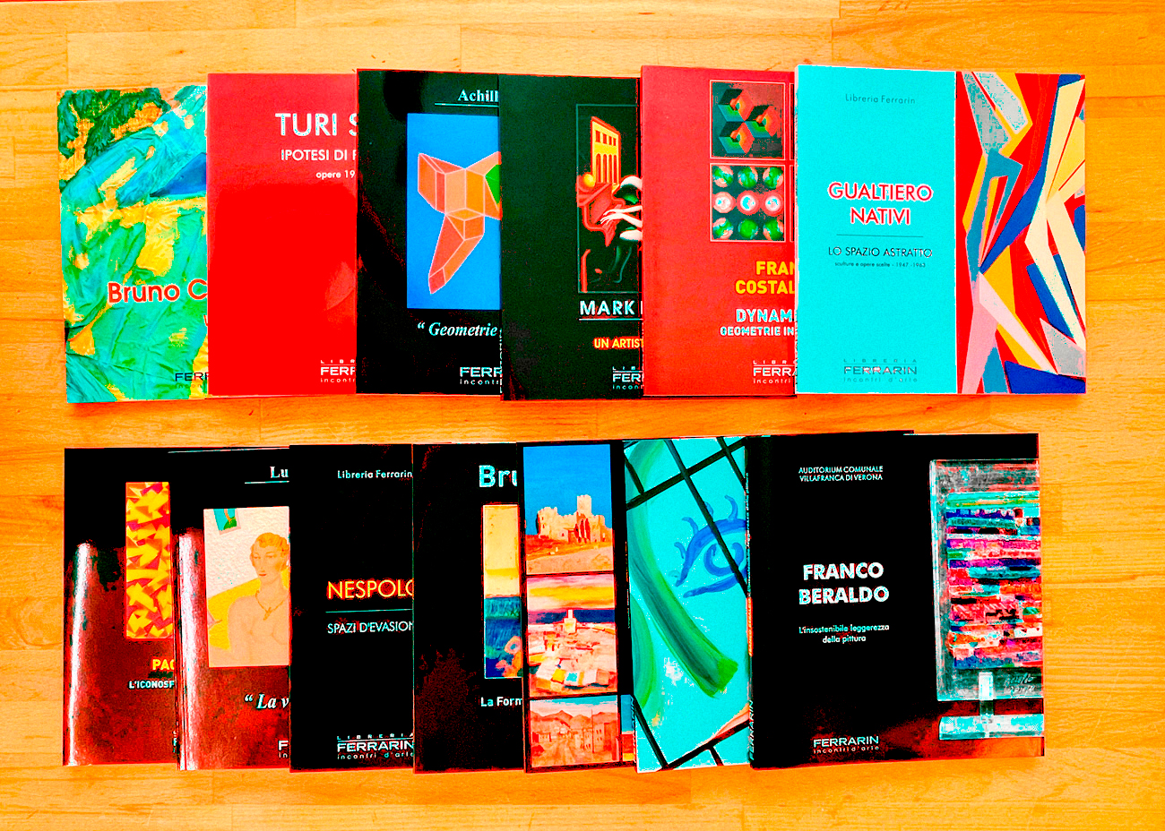 Interessante lotto di 13 cataloghi editi dall Galleria Ferrarin, Legnago, relativi ai seguenti artisti: Achille Perilli, Mark Kostabi, Franco Costalonga, Luca Linari, Paola Bernardi, Gualtiero Nativi, Bruno Saetti, Virgilio Guidi, Salvatore Magazzini, Franco Beraldo, Ugo Nespolo, Turi Simeti e Bruno Ceccobelli
