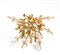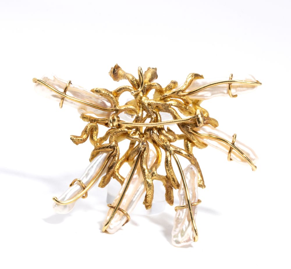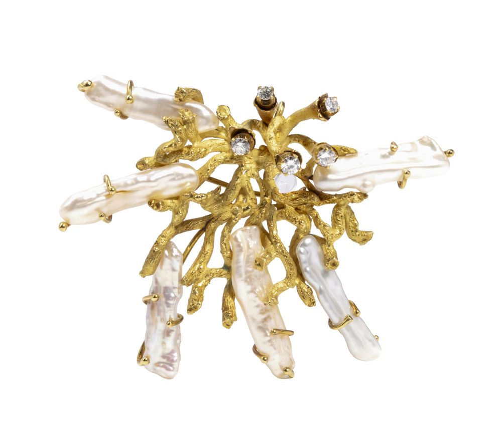 in oro giallo, a forma di rami corallini, impreziosita da perle scaramazze e n. 05 diamanti di forma rotonda, taglio brillante, stimati per un peso di circa 0.30 ct, colore G-H, purezza VS, come misurati e classificati nella montatura