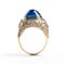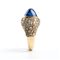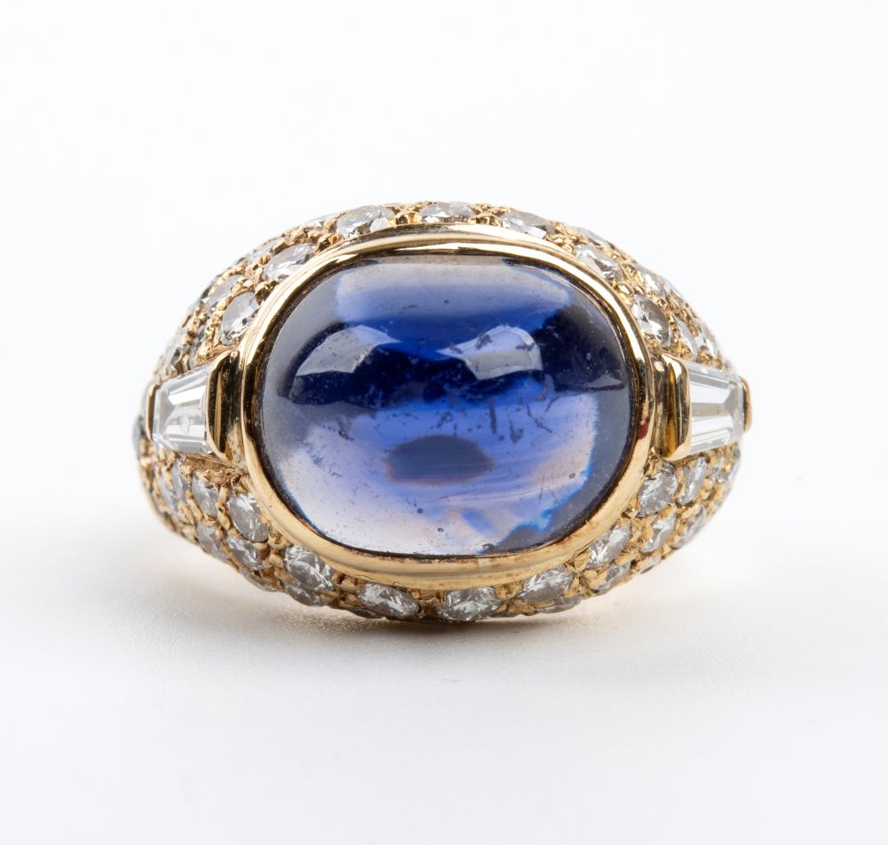 in oro giallo 18k, con voluminosa montatura a forma di cupola, che si assottiglia verso la base, pensata per mettere in risalto la gemma centrale, uno zaffiro ovale taglio cabochon, affiancato da coppia di diamanti taglio tapered, la montatura è impreziosita da pavè di diamanti taglio brillante. Firmato "F. MORONI".