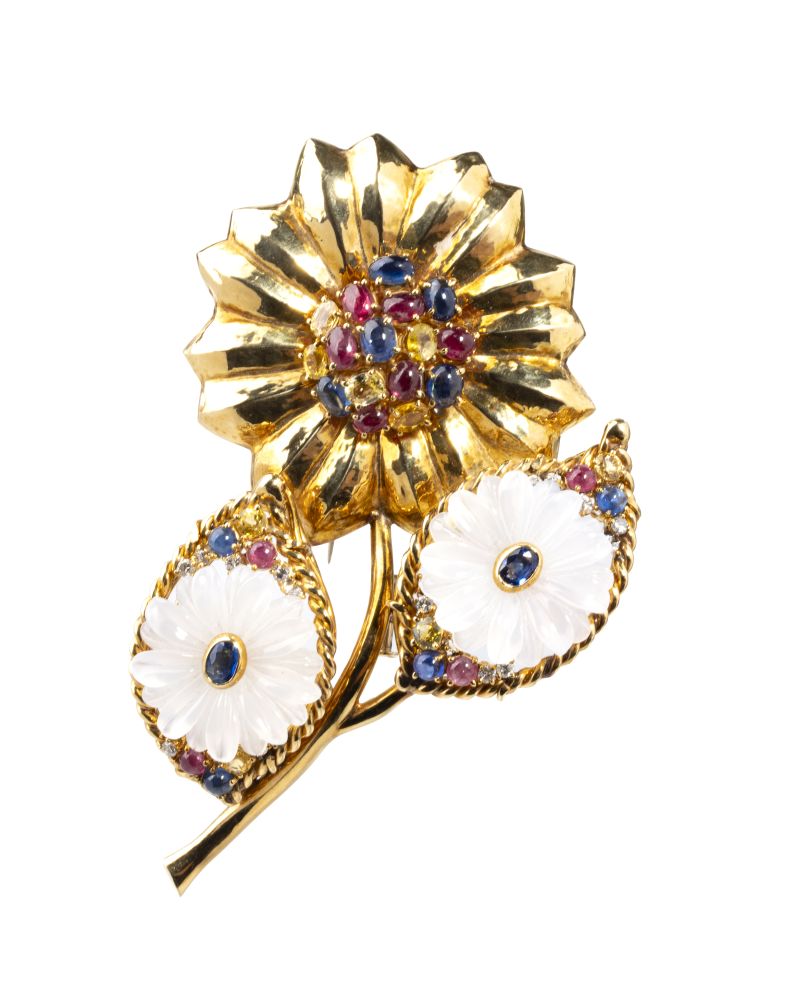 a forma di fiore, in oro giallo 18k, impreziosito da corindoni di vari colori, diamanti e quarzi.