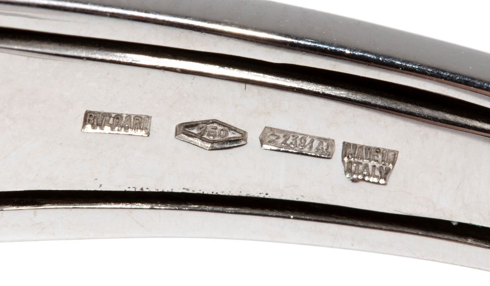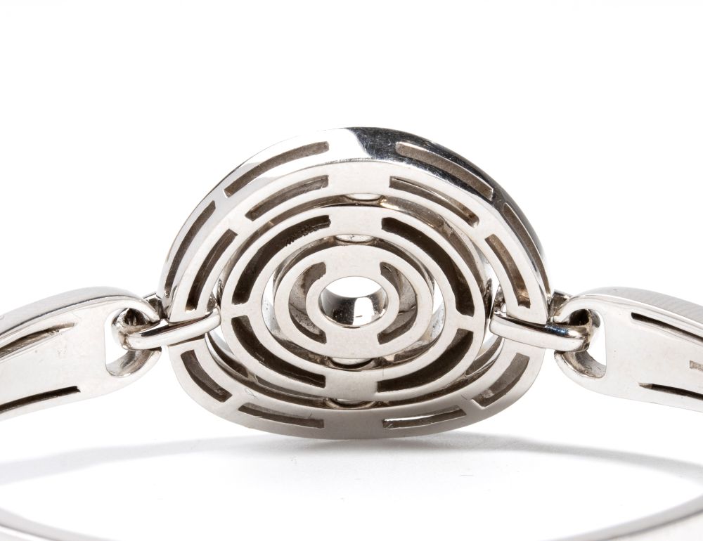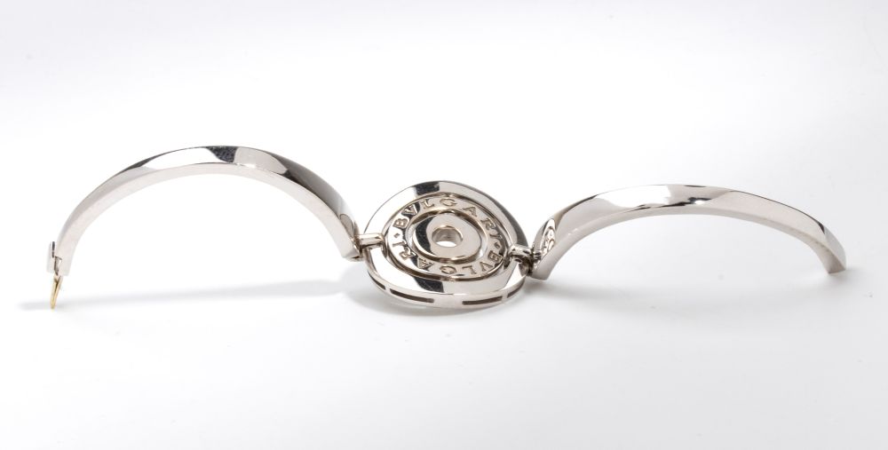 a cerchio rigido con decorazione centrale mobile, in oro bianco 18k. Firmato BULGARI.