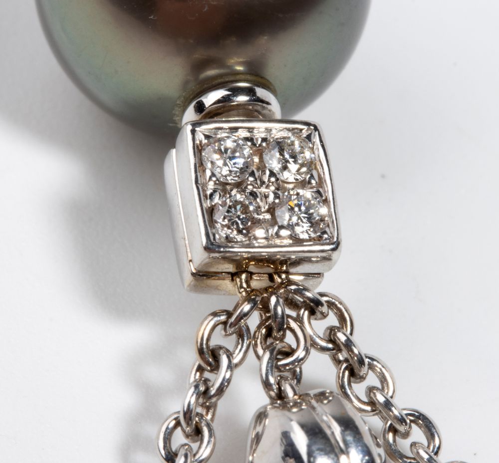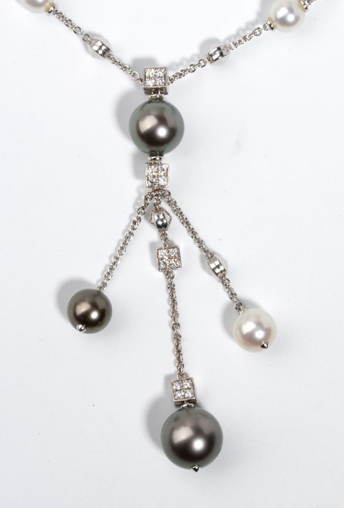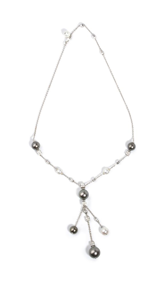 girocollo con frangia a maglie in oro bianco 18k, composto di un'alternanza di elementi geometrici in diamanti e perle coltivate d'acqua salata. Firmato "BVLGARI"