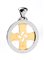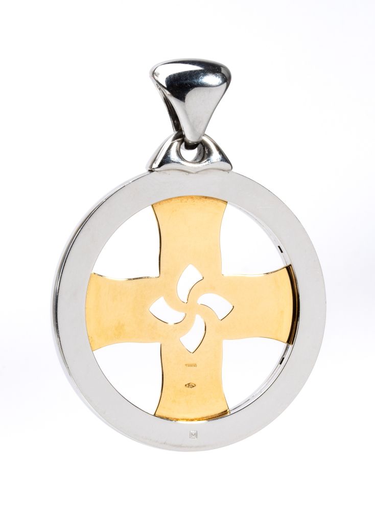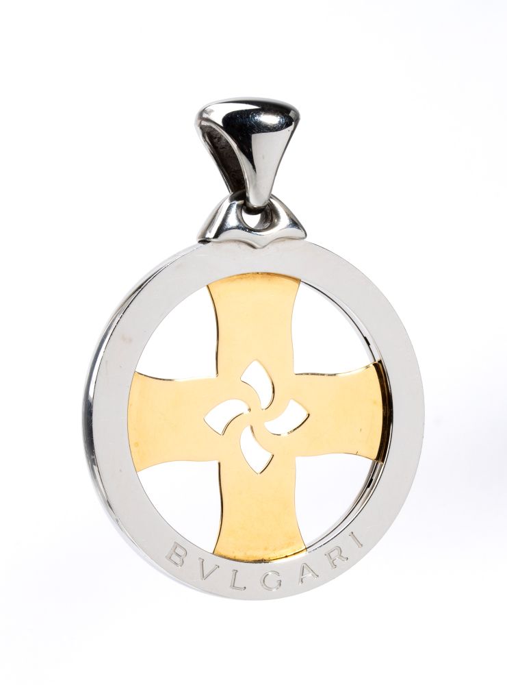 a forma di croce traforata, in oro giallo 18k, tra cornice in acciaio. Firmato BVLGARI.