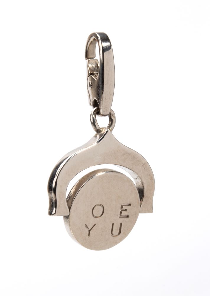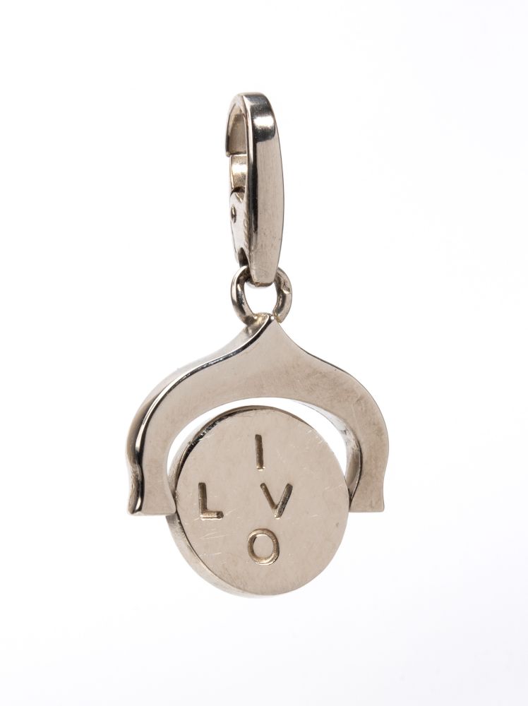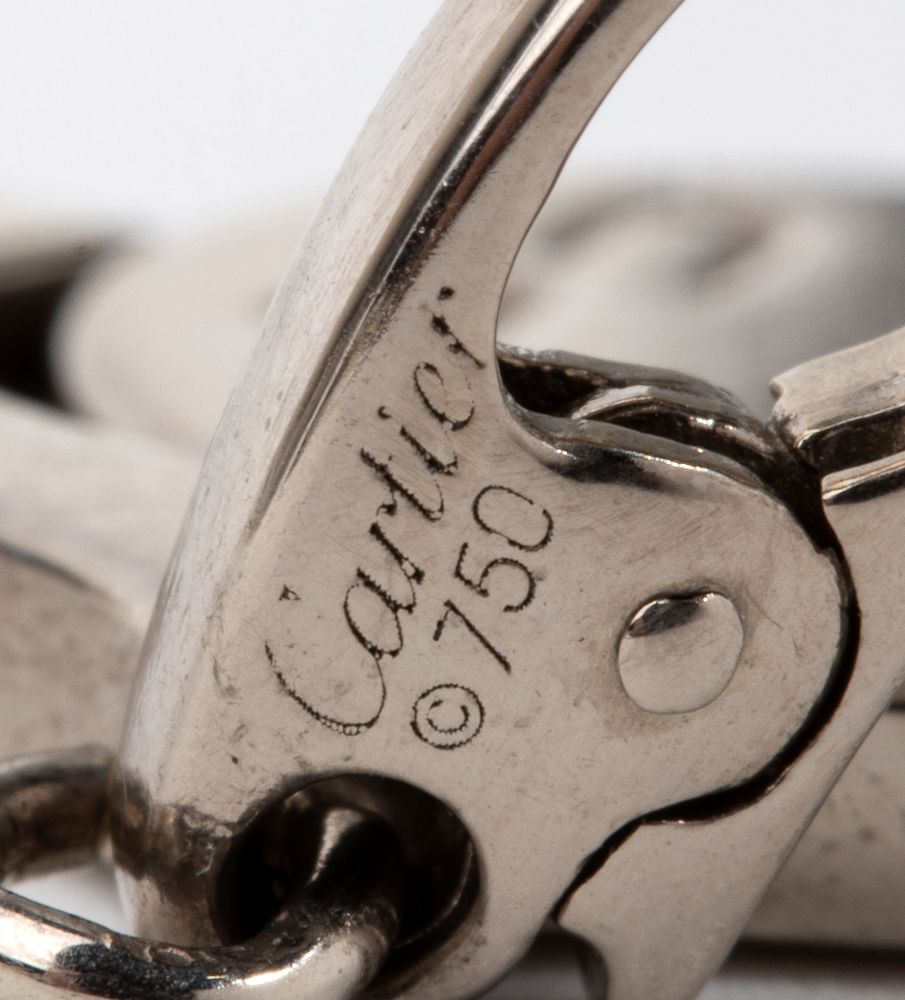 in oro bianco 18k, con disco centrale recante inciso sul fronte e sul retro lettere che nella rotazione compongono la frase "I LOVE YOU". Firmato CARTIER.
