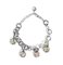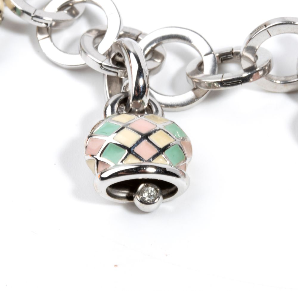 catena a maglia forzatina in oro bianco 18k, con piccole campanelle pendenti decorate con smalti policromi e piccoli diamanti.