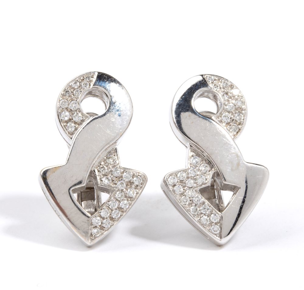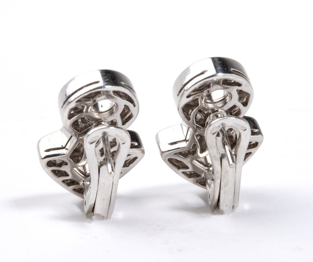 in oro bianco 18k, incastonati con pavé di diamanti di forma rotonda, taglio brillante, stimati per un peso totale di circa 0.60 ct, colore F-G, purezza VVS, come misurati e classificati nella montatura.