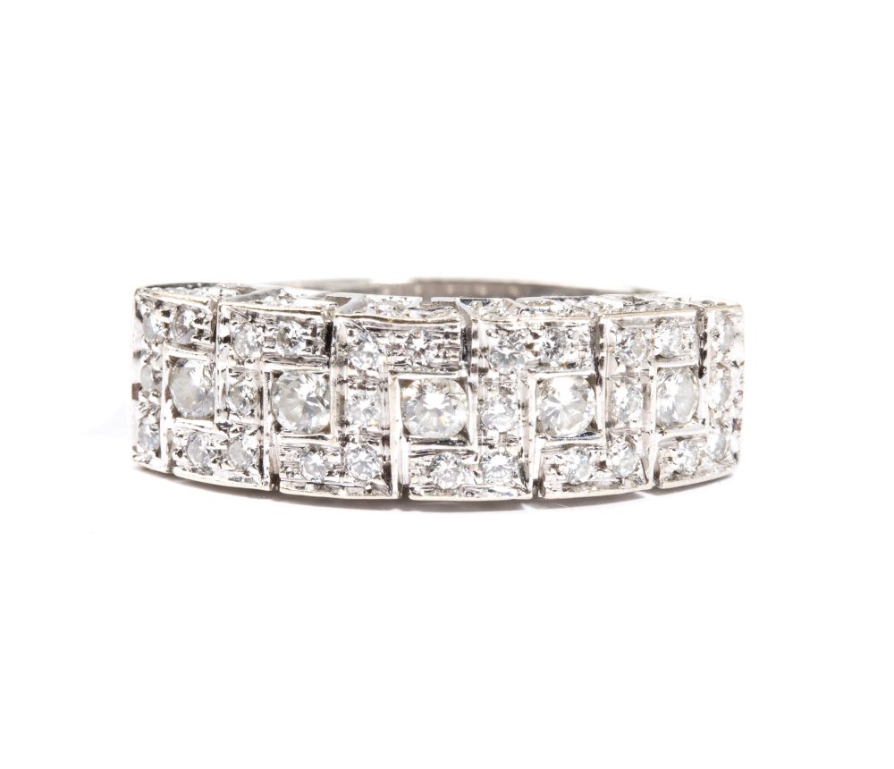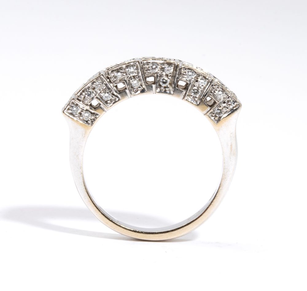 in oro bianco 18k, con motivi geometrici impreziositi da diamanti di forma rotonda, taglio brillante, circa 1.00 ct. Firmato "SALVINI".