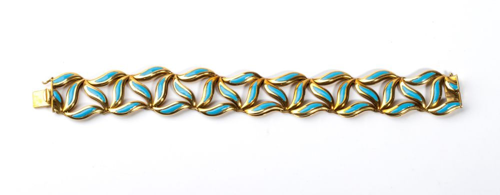 oro giallo 18k, composto da serie di maglie articolate, decorate con smalto turchese, che riproducono la forma di foglie stilizzate creando un effetto dinamico.