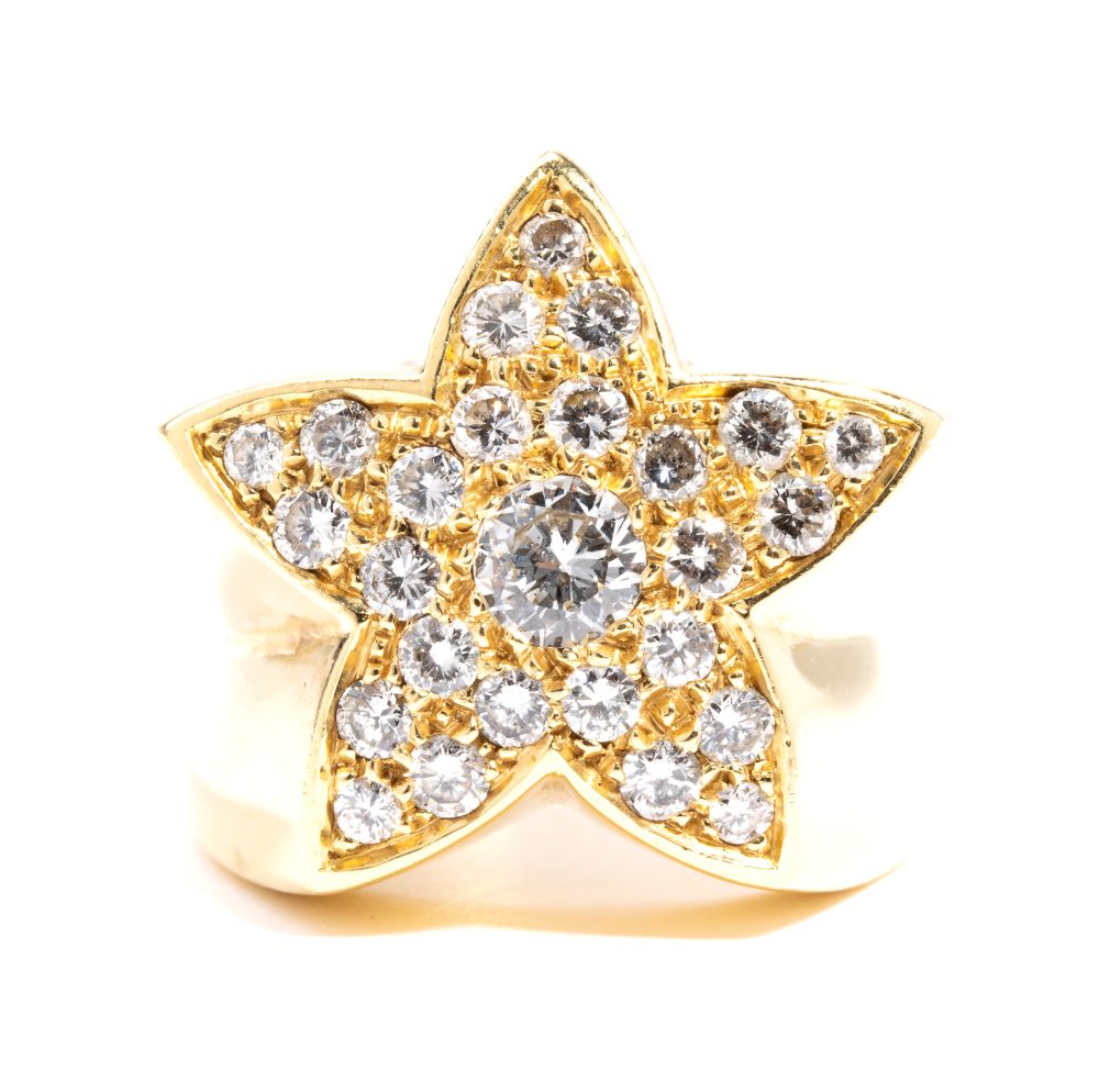 a forma di stella in oro giallo, impreziosito da un pavé di diamanti, stimati per un peso di 1.60 ct circa, colore G-H, purezza VS-SI come misurati e classificati nella montatura.