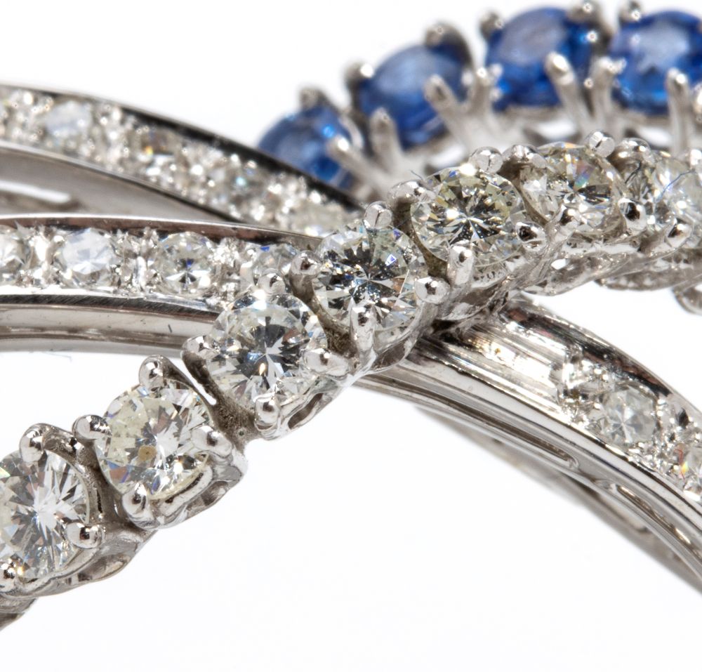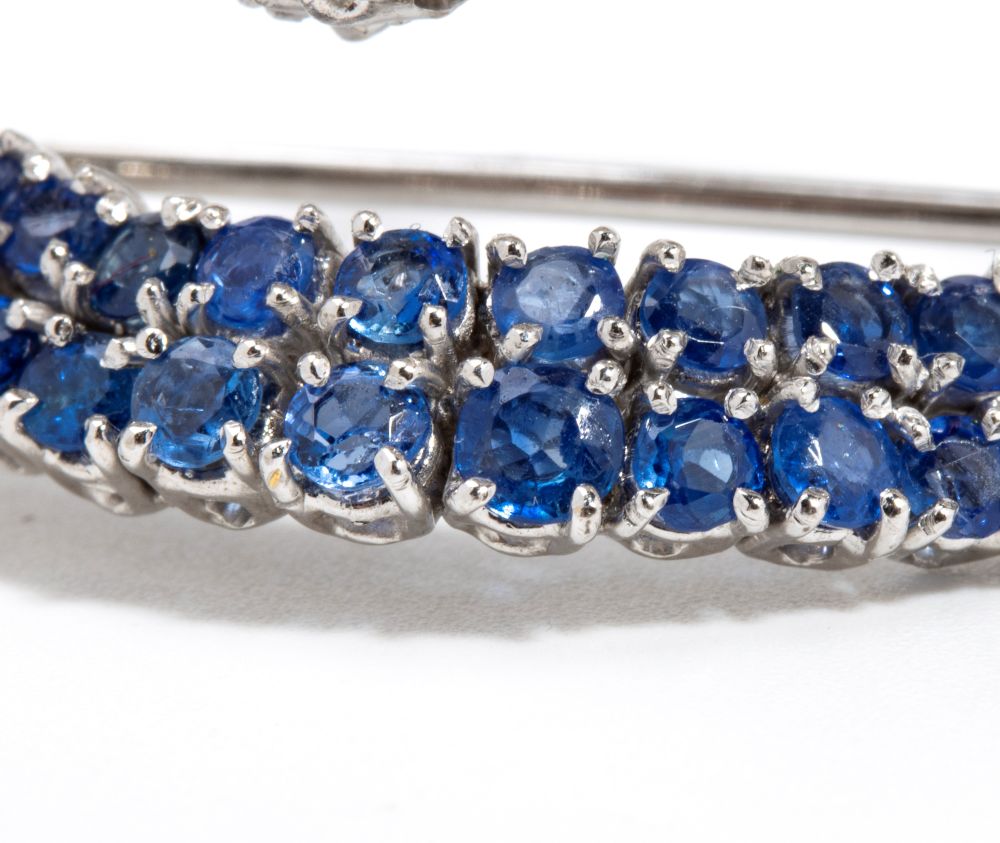 in oro bianco 18k, con motivo di nastri in diamanti e zaffiri.