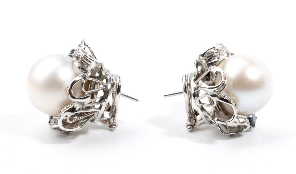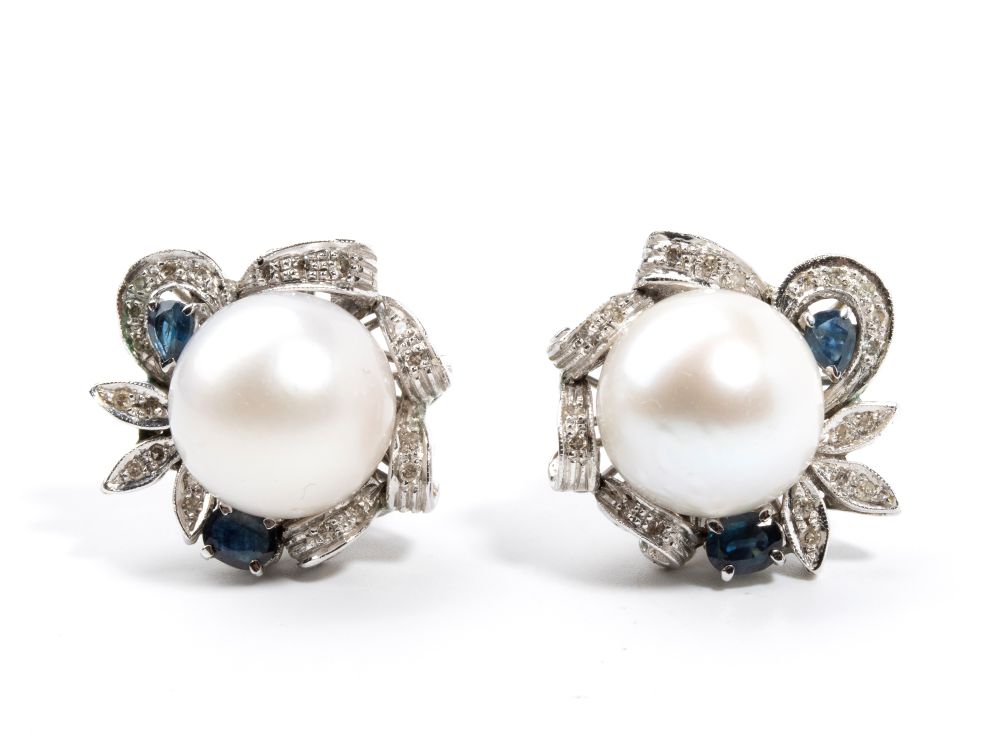 Orecchini in oro con perle Australiane, diamanti e zaffiri