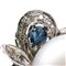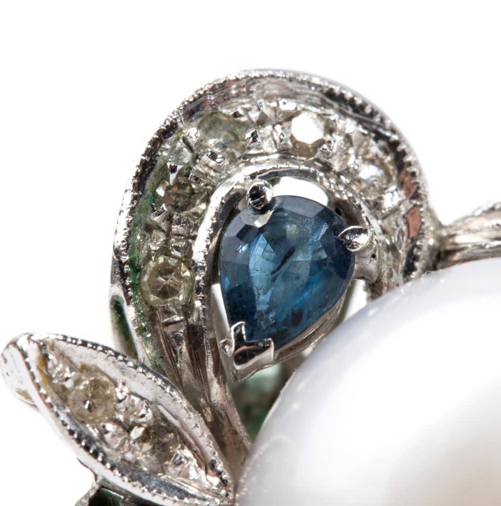in oro bianco 14k, a motivo floreale, con perla coltivate contornata da diamanti taglio huit-huit, taglio a rosa e zaffiri.