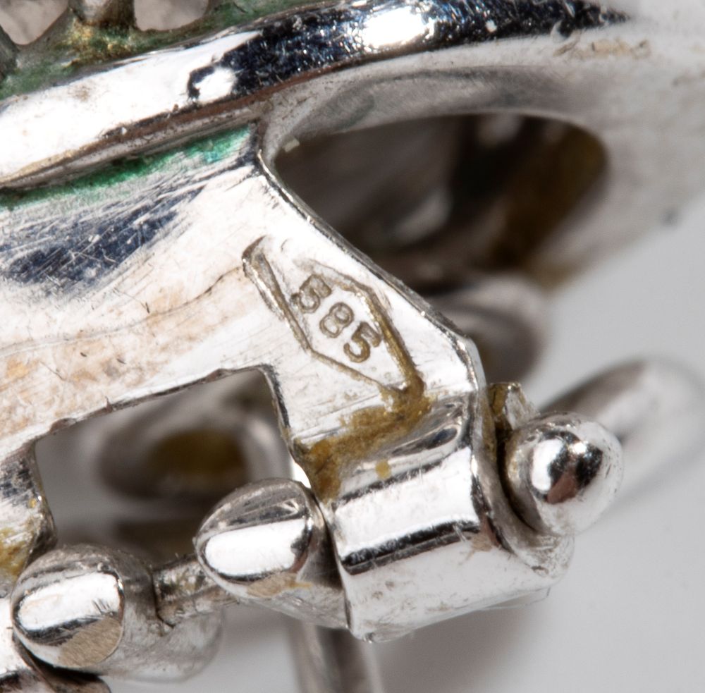 Punzonato "585". Diametro perle 14 - 14.5 mm. Dimensioni: 2.5 x 2.5 cm. Peso: 25 gr.