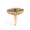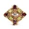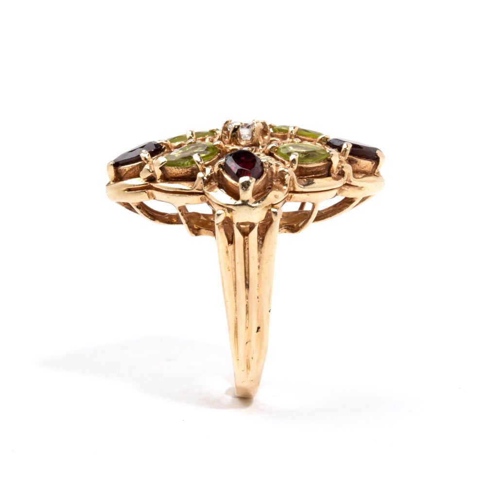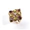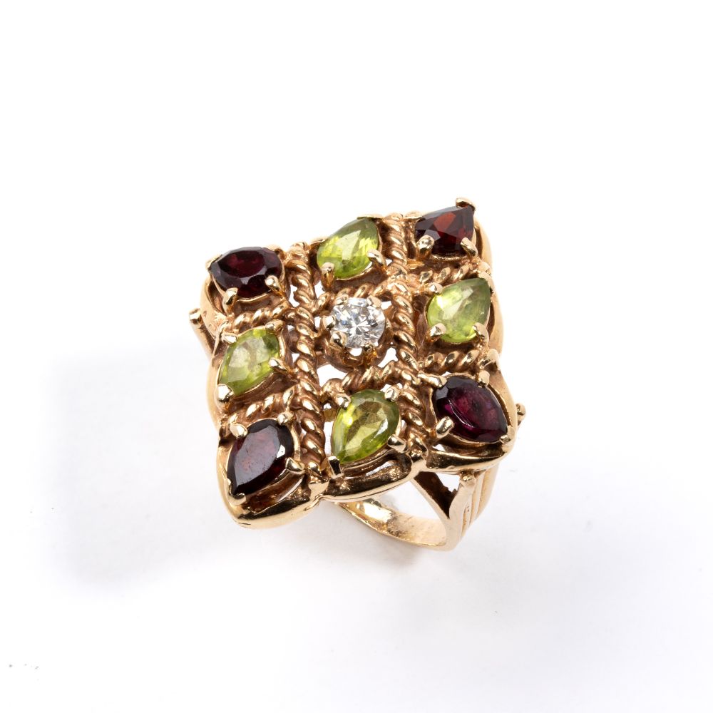 in oro rosa 18k, di forma geometrica, impreziosito da un diamante centrale di forma rotonda, taglio brillante, circa 0.20 ct, colore H, purezza VS, contornato da gocce di peridoti e granati.