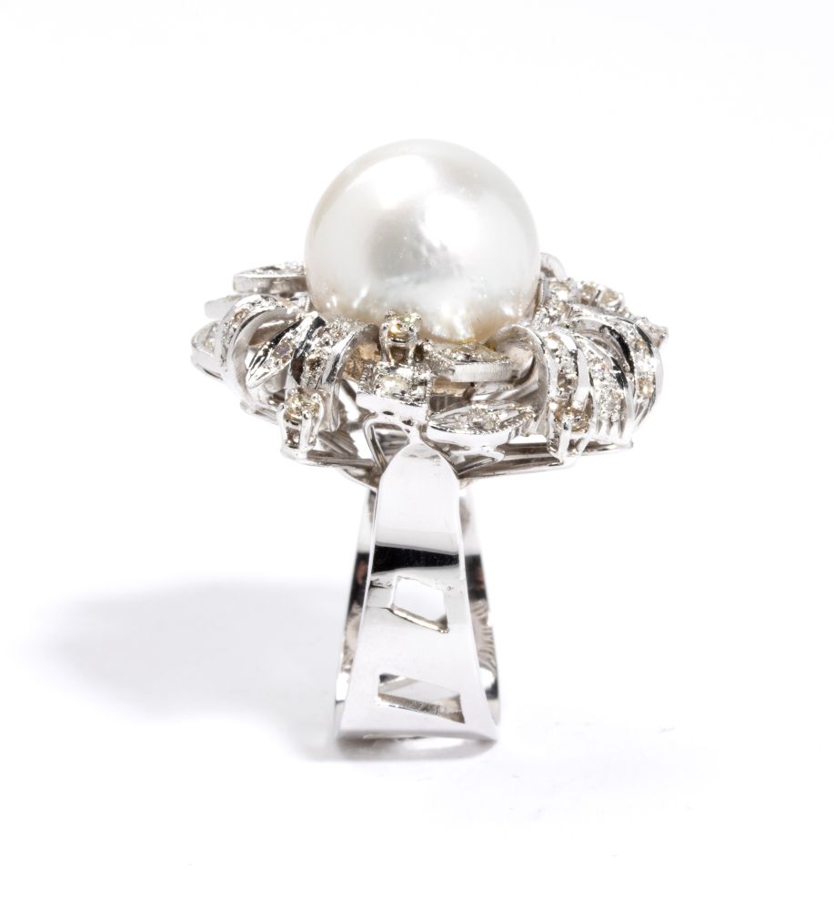 a forma di fiore, in oro bianco 14k, con perla Australiana centrale contornata da diamanti di forma rotonda, taglio brillante, stimati per un peso totale di circa 1.20 ct, colore H-I, purezza VS-SI, come misurati e classificati nella montatura. .