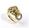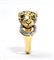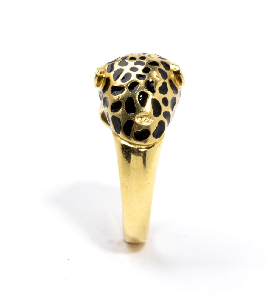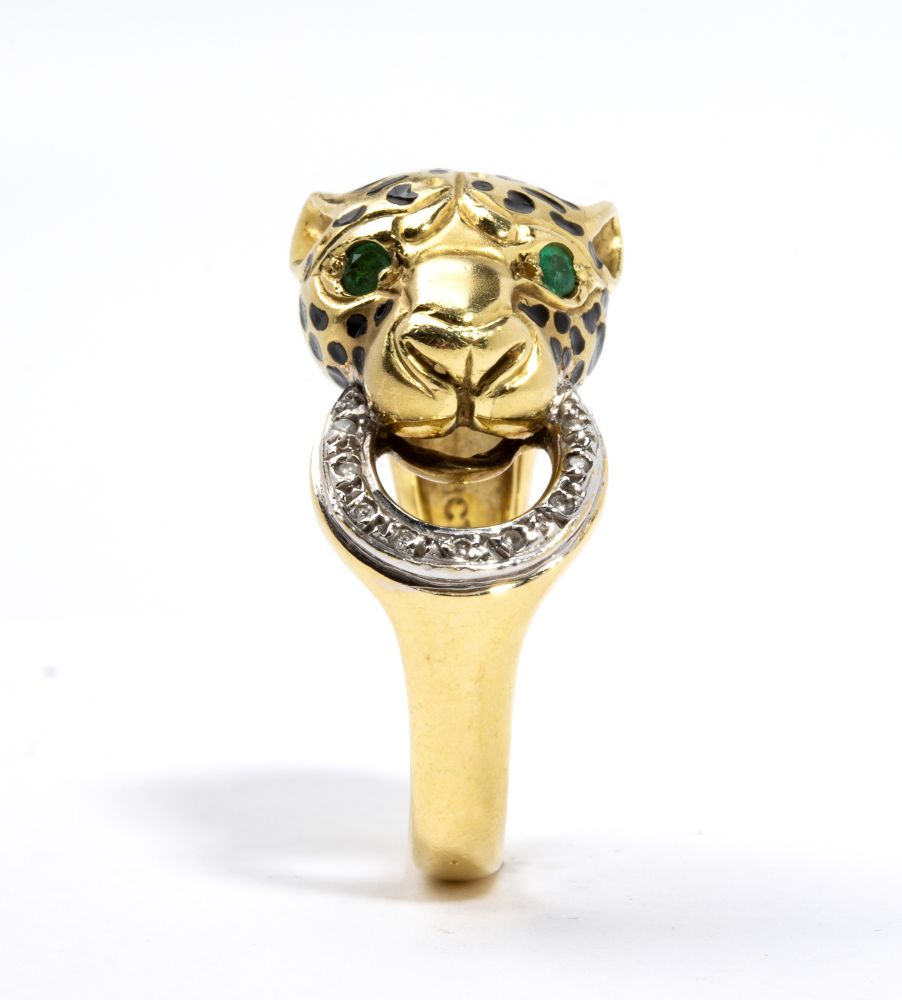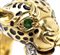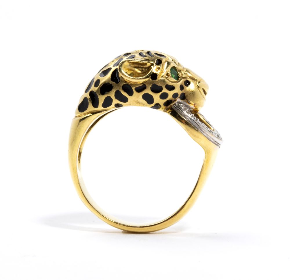 a forma di testa di leopardo che si morde la coda, in oro giallo ed oro bianco 18k, decorato con smalti, diamanti e smeraldi.