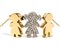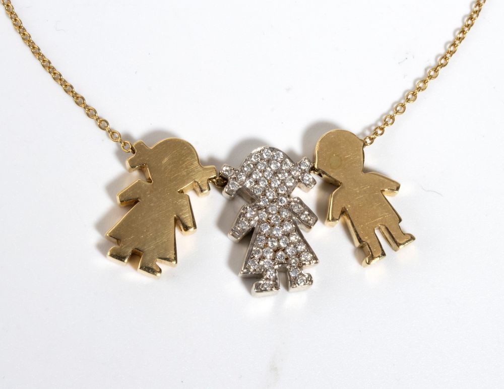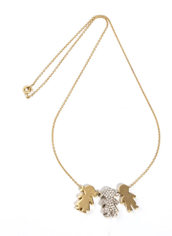 in oro giallo 18k, con sottile catena a cui sono sospesi una coppia di pendenti raffiguranti le sagome stilizzate di bambine di cui una incastonata con pavé di diamanti di forma rotonda, taglio brillante, stimati per un peso totale di circa 0.50 ct, colore G-H, purezza VS.