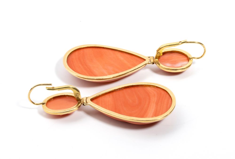 in oro giallo 18k, ciascuno con cabochon e goccia pendente in corallo Cerasuolo inciso (Corllium Elatius).