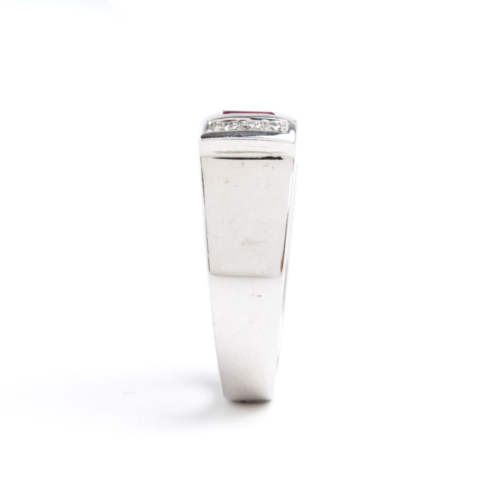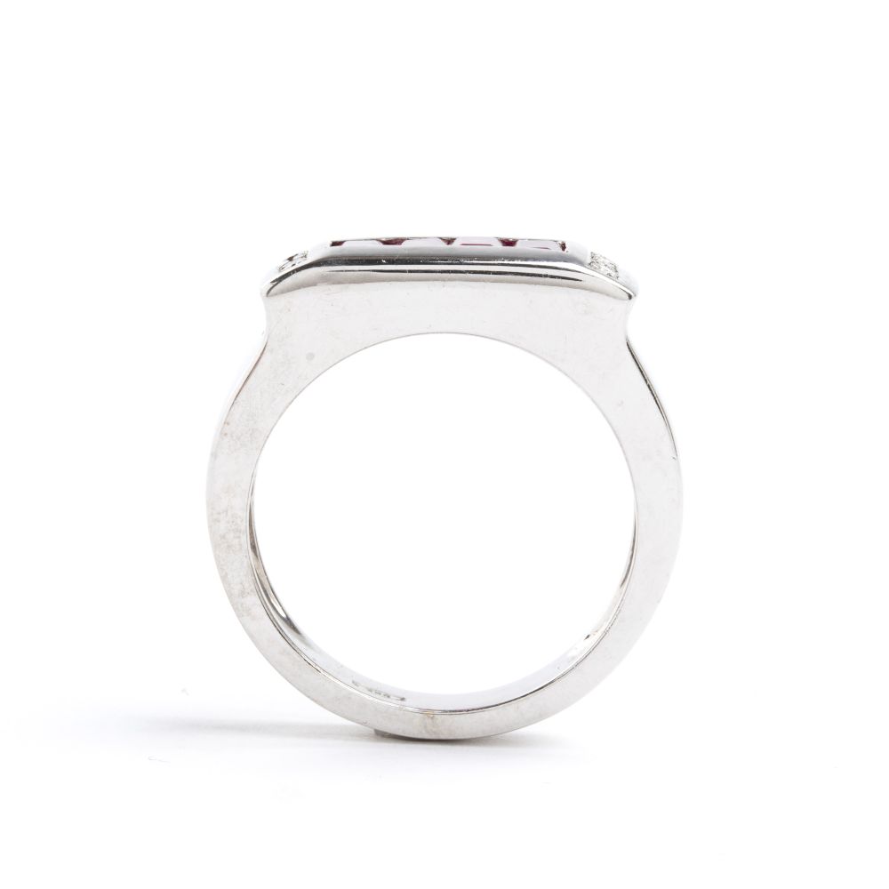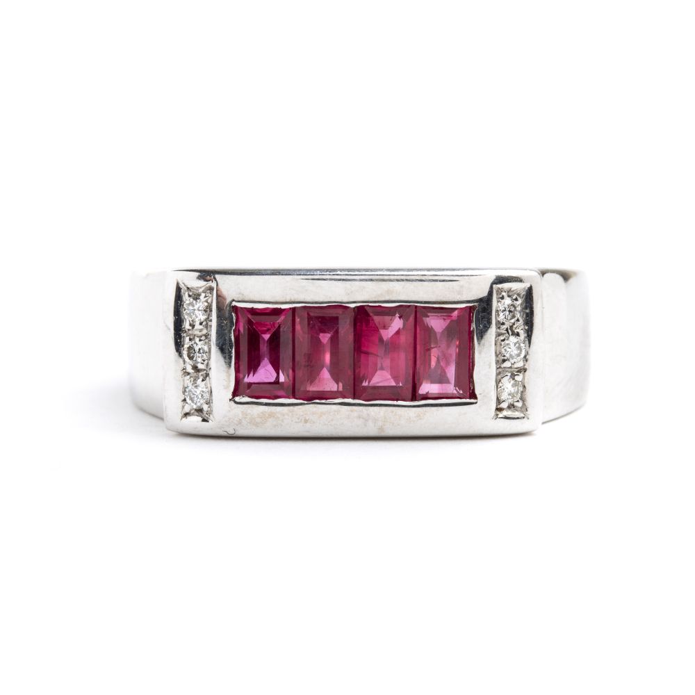 In oro bianco 18k, incastonato con linea di quattro rubini di forma rettangolare stimati per un peso totale di circa 0.80 ct, affiancati da n. 06 diamanti di forma rotonda, taglio brillante, stimati per un peso totale di circa 0.04 ct.