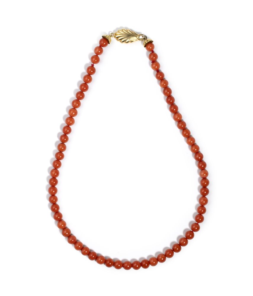 in oro giallo 18k, ad ub filo di sfere di corallo Mediterraneo disposte in gradazione (Corallum Rubrum), fermezza a scomparsa in oro giallo 18k a forma di conchiglia.