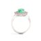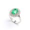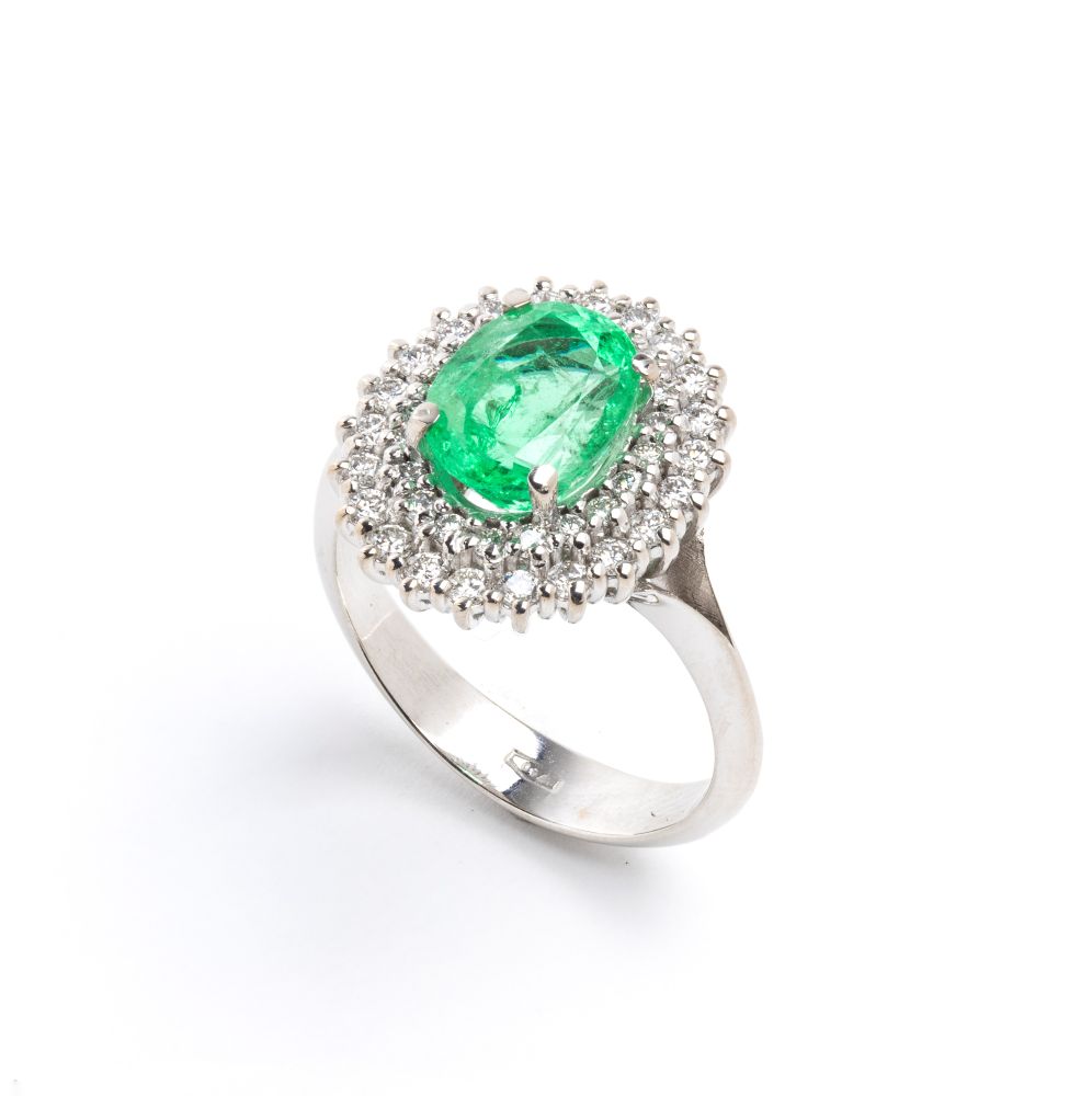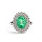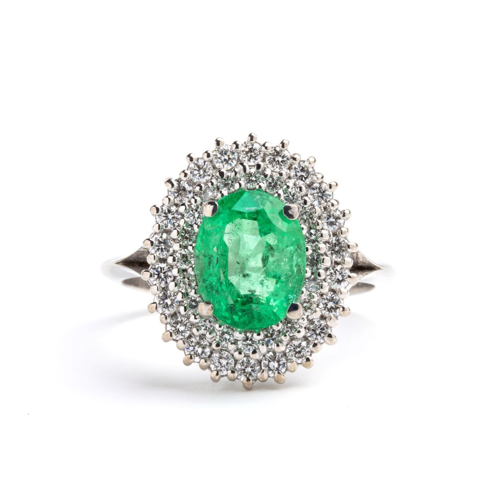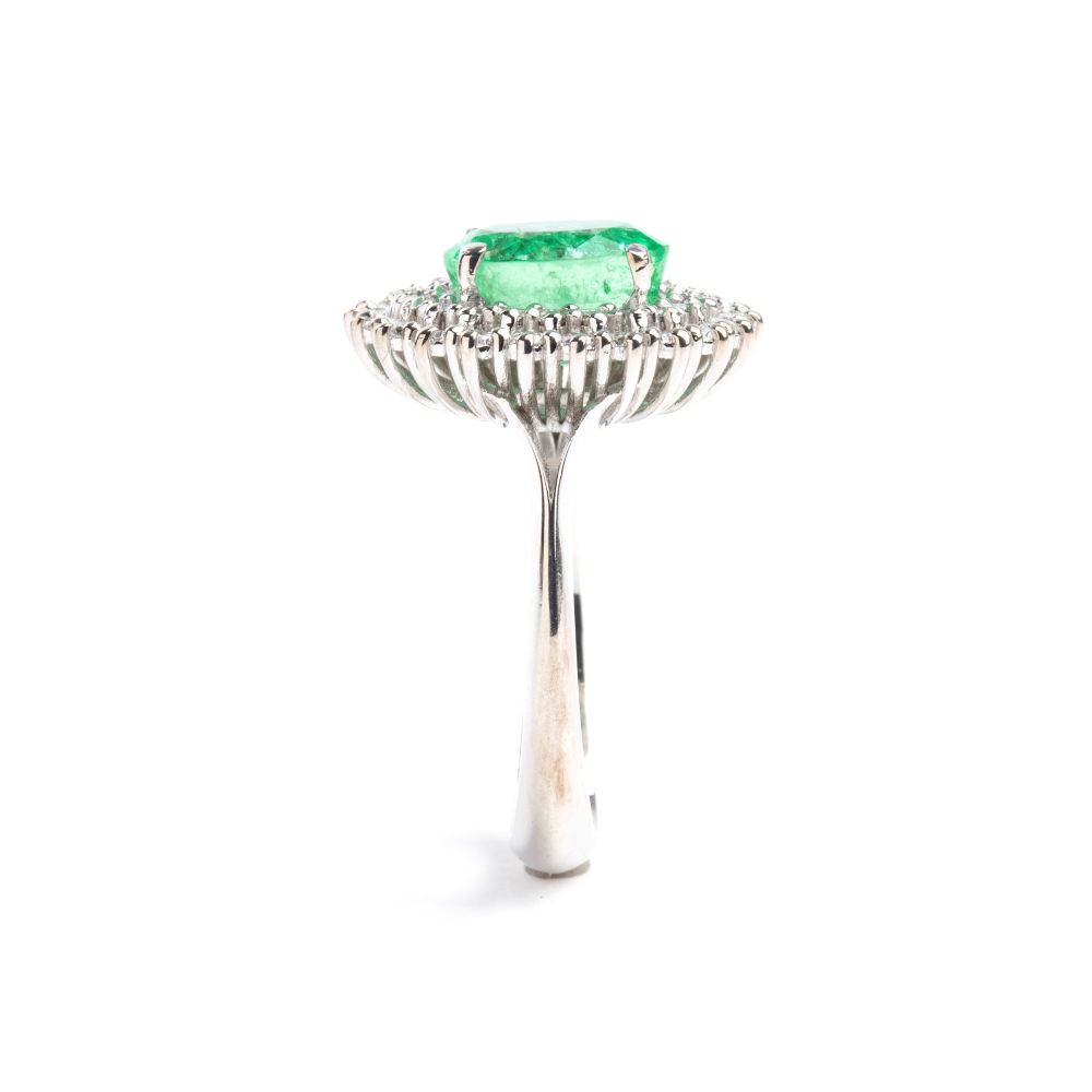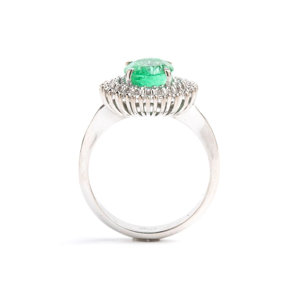in oro bianco 18k, incastonato con smeraldo ovale tra doppia cornice di diamanti.