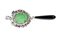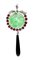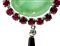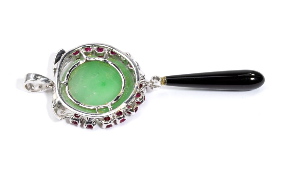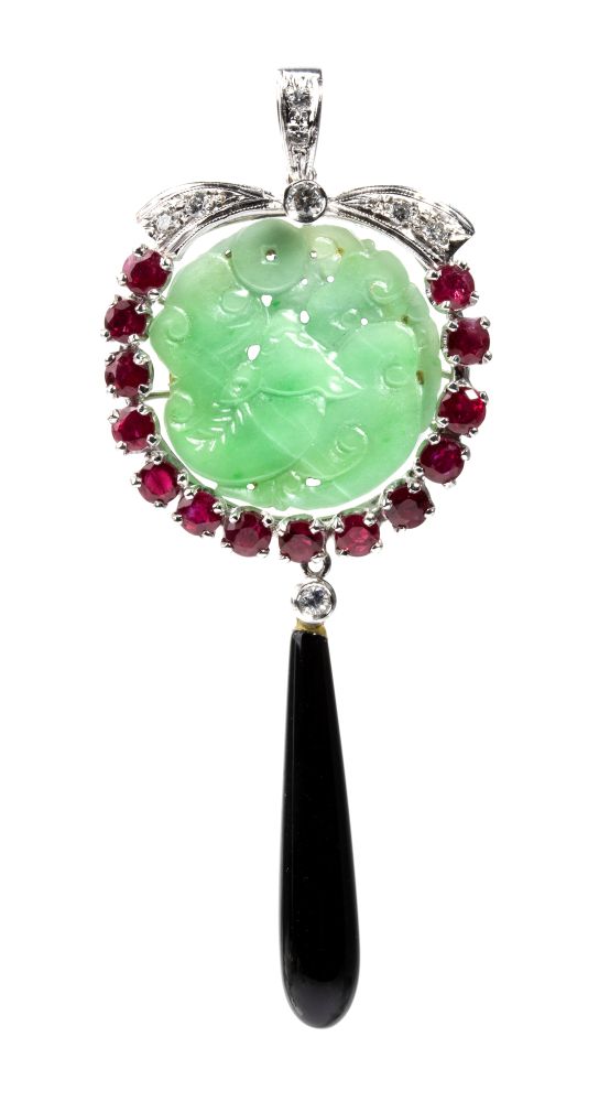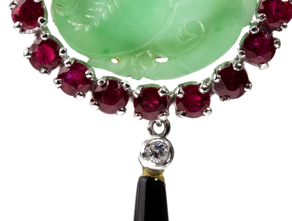 in oro bianco 18k, con un inserto in giada incisa a motivi floreali, sormontata da fiocco in diamanti, incorniciata da linea di rubini, a cui è sospeso in pendente a goccia in onice.