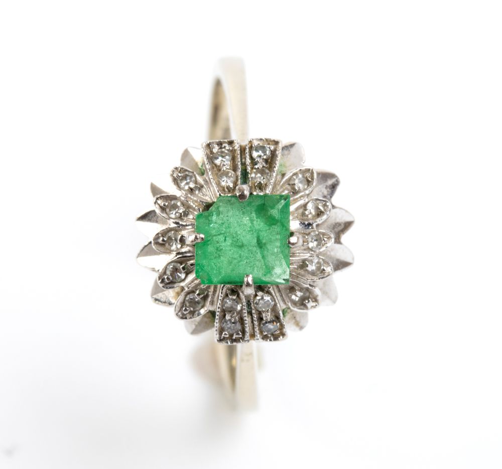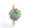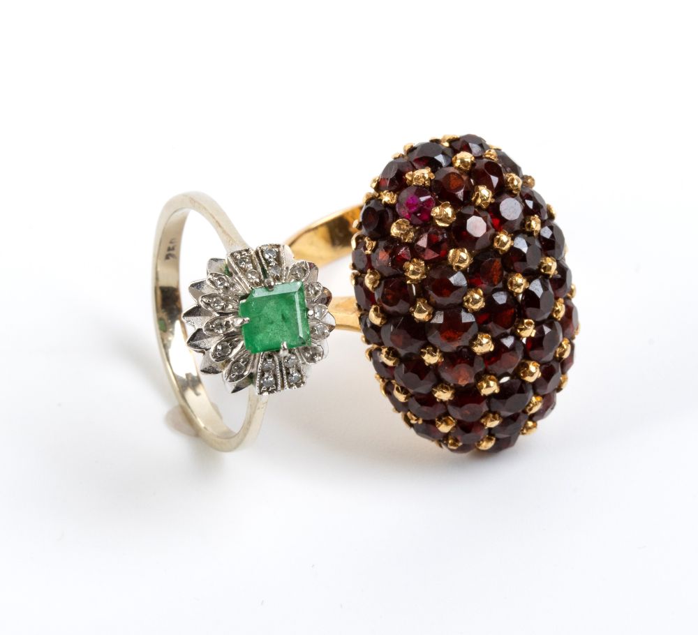 in oro giallo ed oro bianco 18k, lotto composto da: un anello con pavé di granati e un anello con motivo a fiore con smeraldo e diamanti taglio huit-huit.