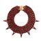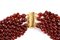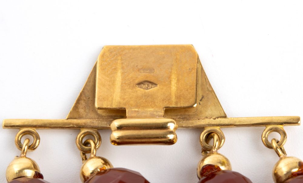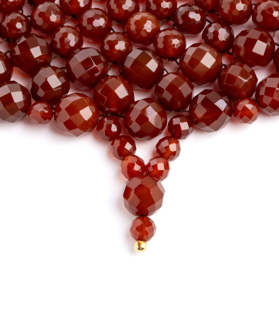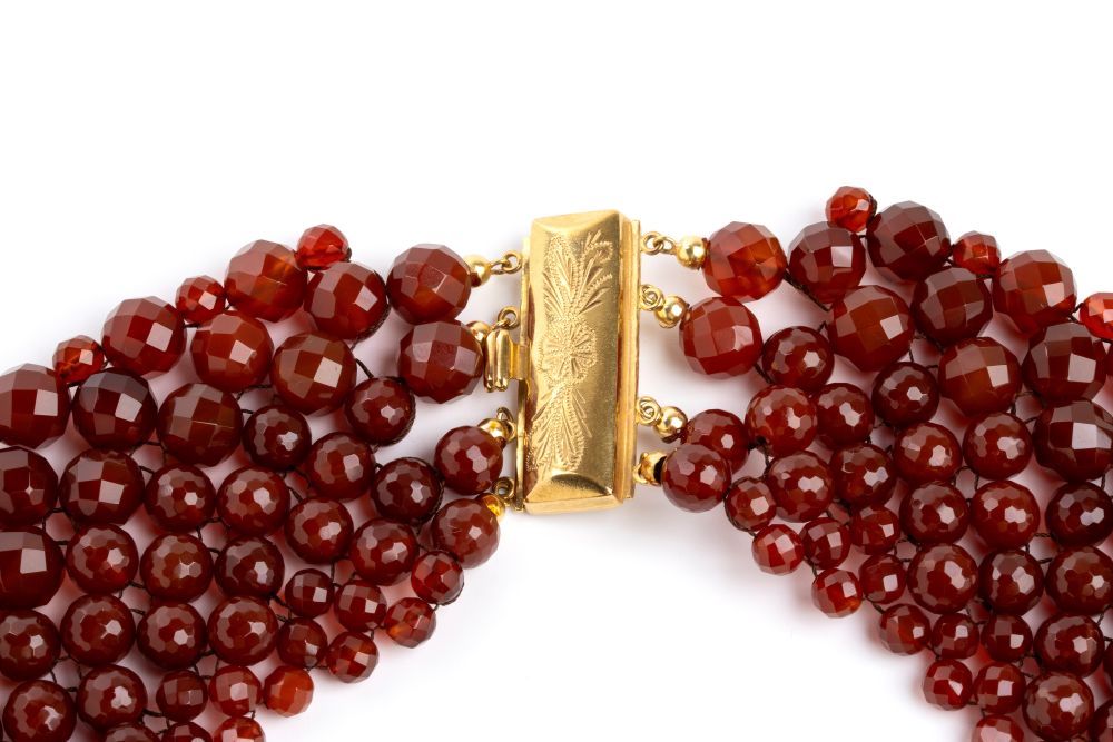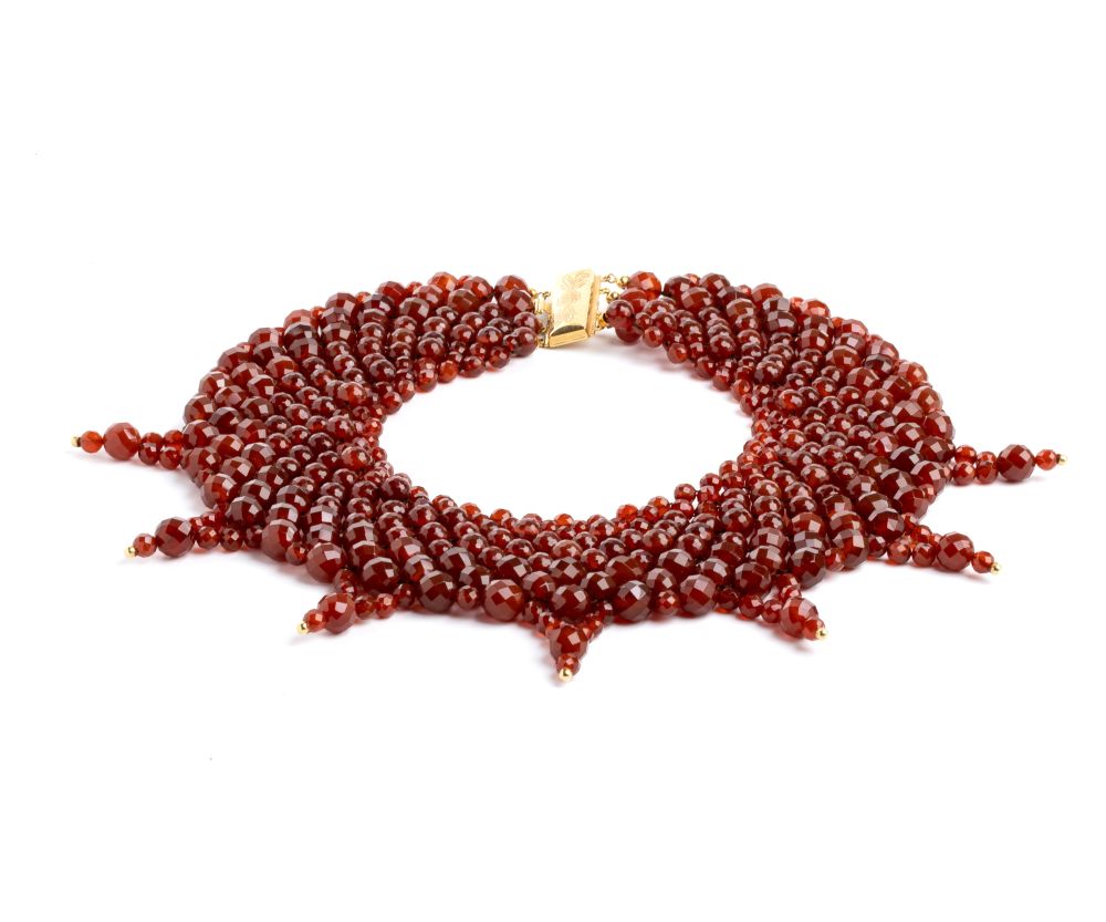 collana con struttura multifili in sfere sfaccettate di corniola, culminanti in punte decorative, richiamando lo stile di gioielli d'epoca o etnici; fermezza in oro giallo 18k.
