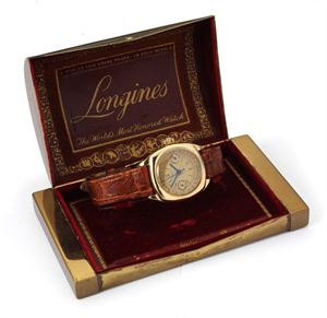 LONGINES Cronografo monopulsante in oro giallo anni '30 Diametro 34 mm Di forma carré galbé con pulsante cronografico coassiale alla corona di carica, quadrante con contatore piccoli secondi ad ore 9 e a 30 minuti ad ore 3, indici applicati, lancette in metallo brunite, scala tachimetrica bicolore periferica. Movimento a carica manuale calibro 1333 Corredato di astuccio d'epoca. An yellow gold chronograph mono-pusher