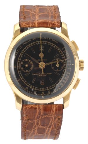 LONGINES Cronografo medicale in oro giallo due contatori anni '40 Diametro 37 mm Cassa in tre parti con pulsanti a oliva. Particolare quadrante personalizzato con stemma militare jugoslavo ad ore 12. Contatore secondi continui ad ore 9, a 30 minuti ad ore 3. Scala medicale per la misurazione delle pulsazioni periferica. Corredato di estratto di registro della Maison. An yellow gold medical chronograph two counters 40's