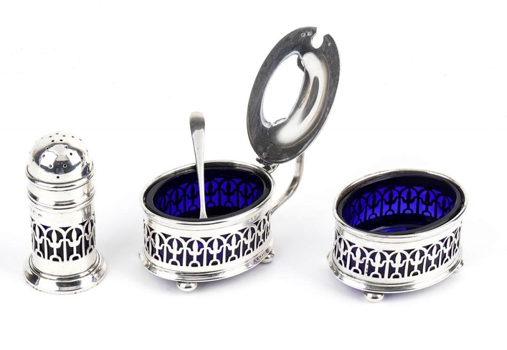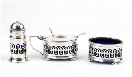 Saliera, pepiera e mostardiera inglesi in argento Birmingham, 1921-1922