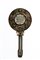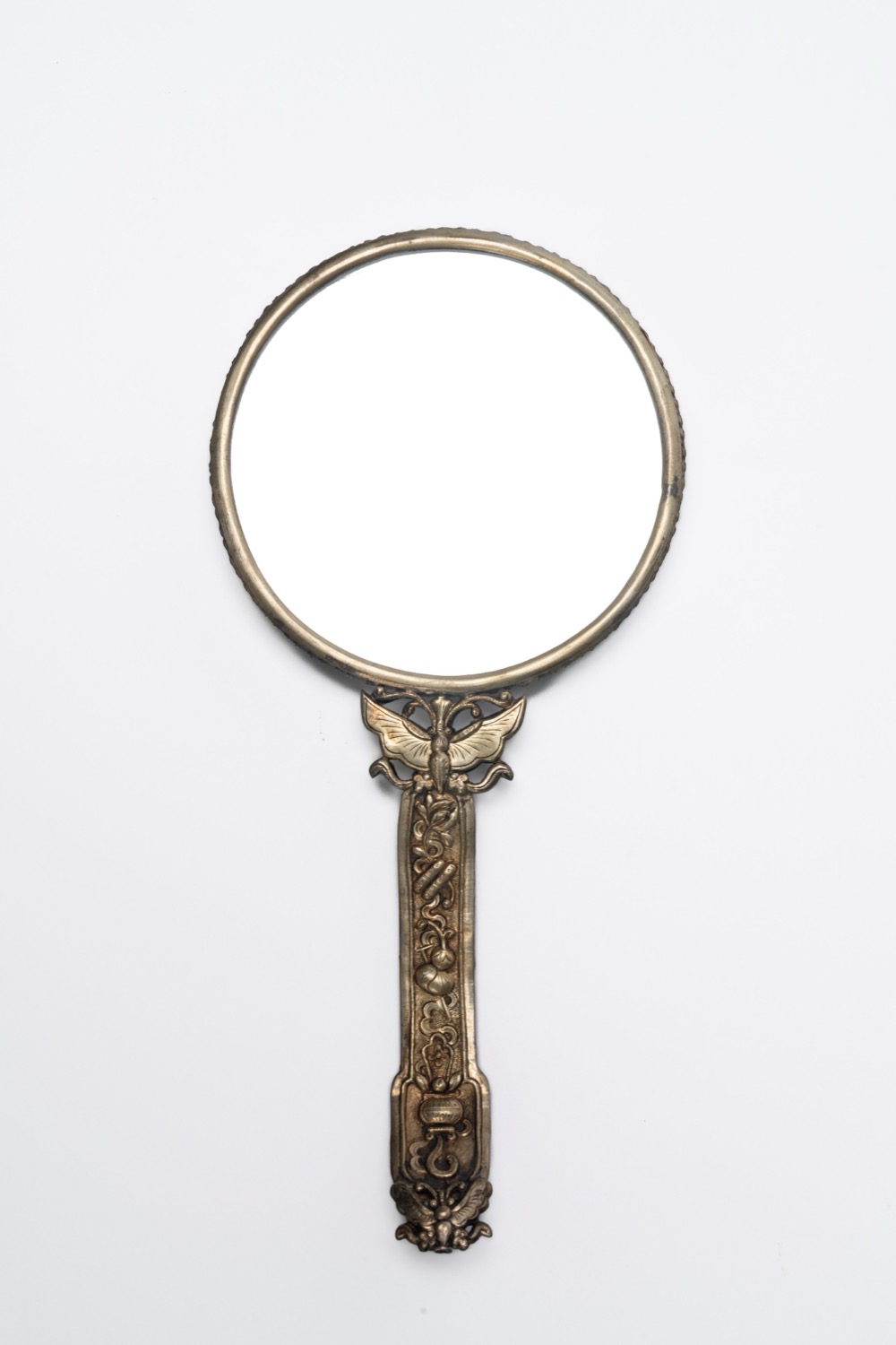 鎏金铜镜,配玉、硬石和珐琅,中国,晚清至民国时期con impugnatura in giada scolpita e montatura in bronzo dorato a rilievo, decorata a motivi di farfalle, fiori e simboli di buon auspicio, arricchita da cabochon in giada e altre pietre dure policrome; al centro del retro è inserita una placca circolare in giada traforata con carattere shuangxi (doppia felicità) fra pipistrelli e motivi vegetali.