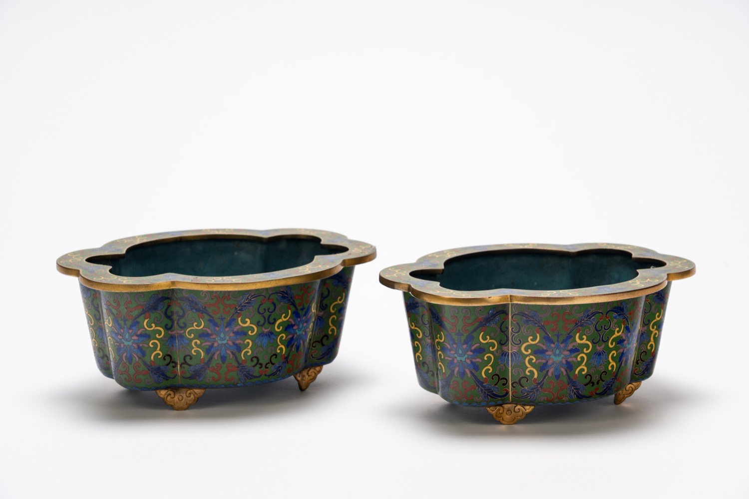 一对掐丝珐琅桌面花盆,中国,十九世纪末di corpo polilobato con bordo sagomato e poggiante su gambe a nuvola; smalto cloisonné policromo su fondo verde con motivi floreali stilizzati e racemi fitomorfi.